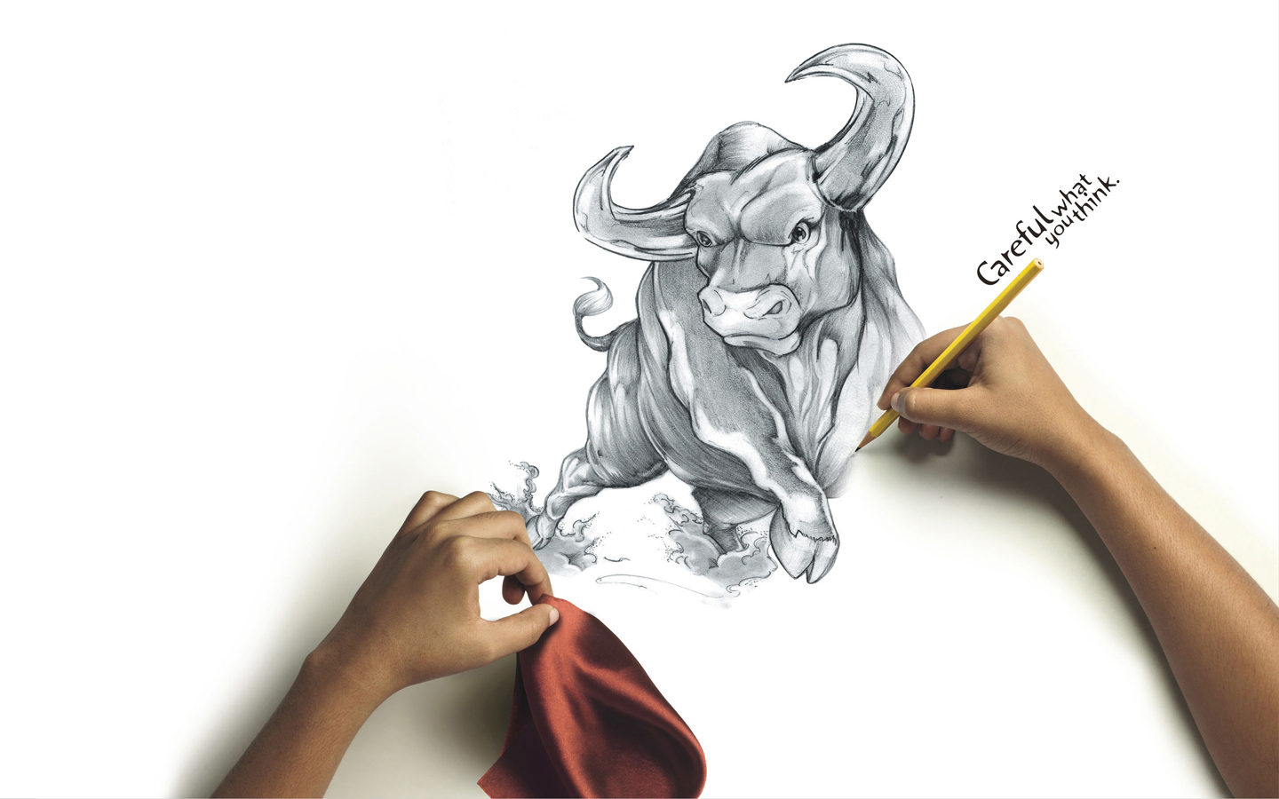 Description: A drawing of a bull with a pencil in its mouth and a person drawing it with a pencil on a paper.
