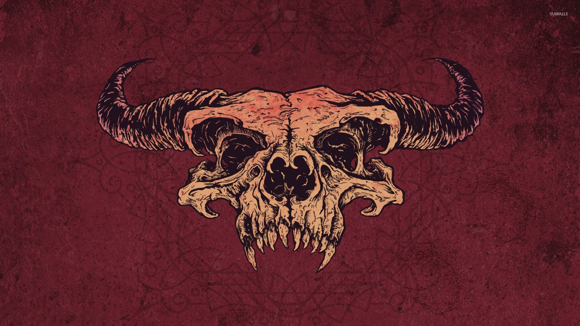 Description: A bull skull with horns on a red background with a grungy effect to it's face.