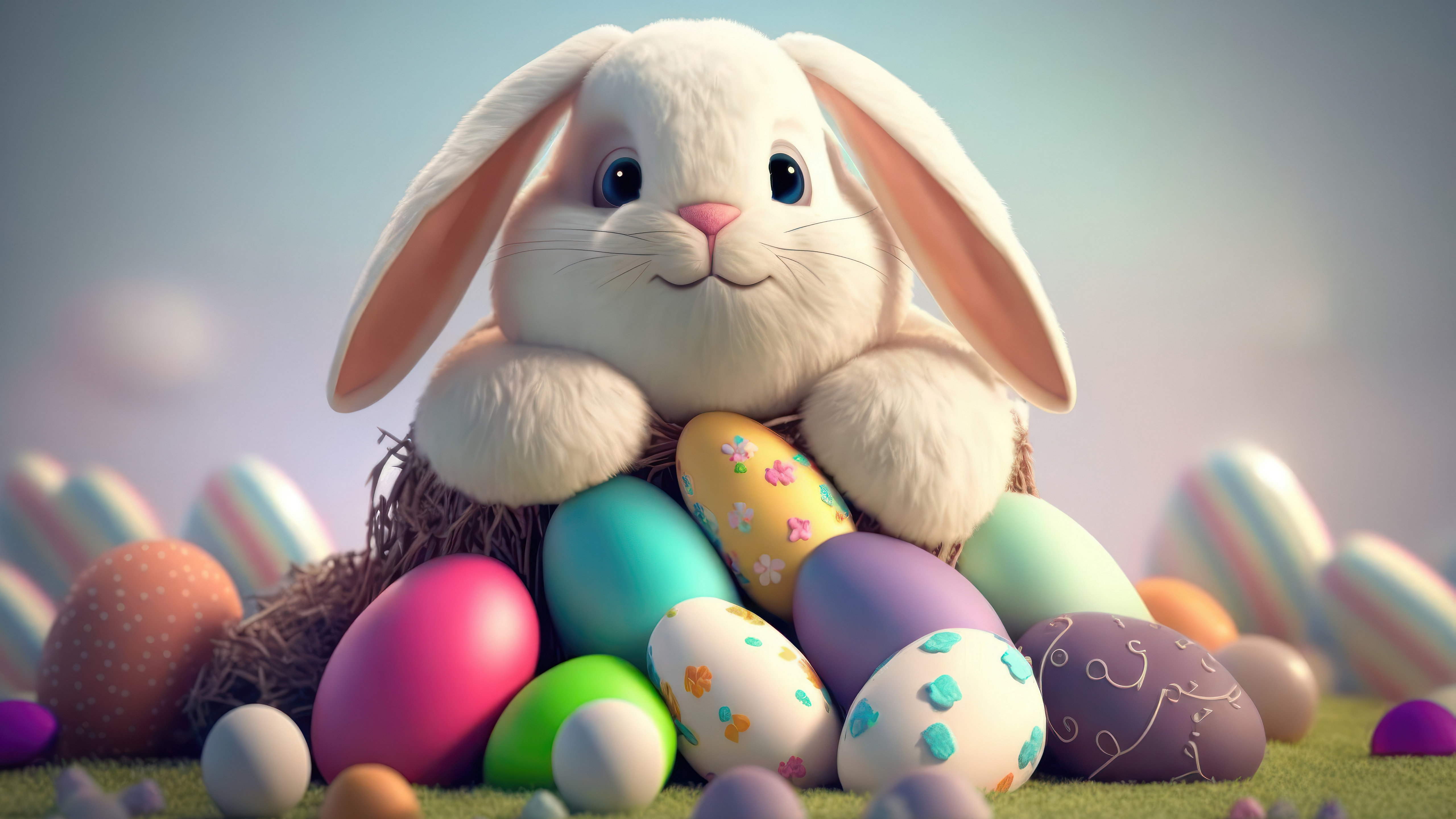 Description: A bunny sitting on top of a pile of eggs in the grass with other eggs around it and a blue sky in the background.
