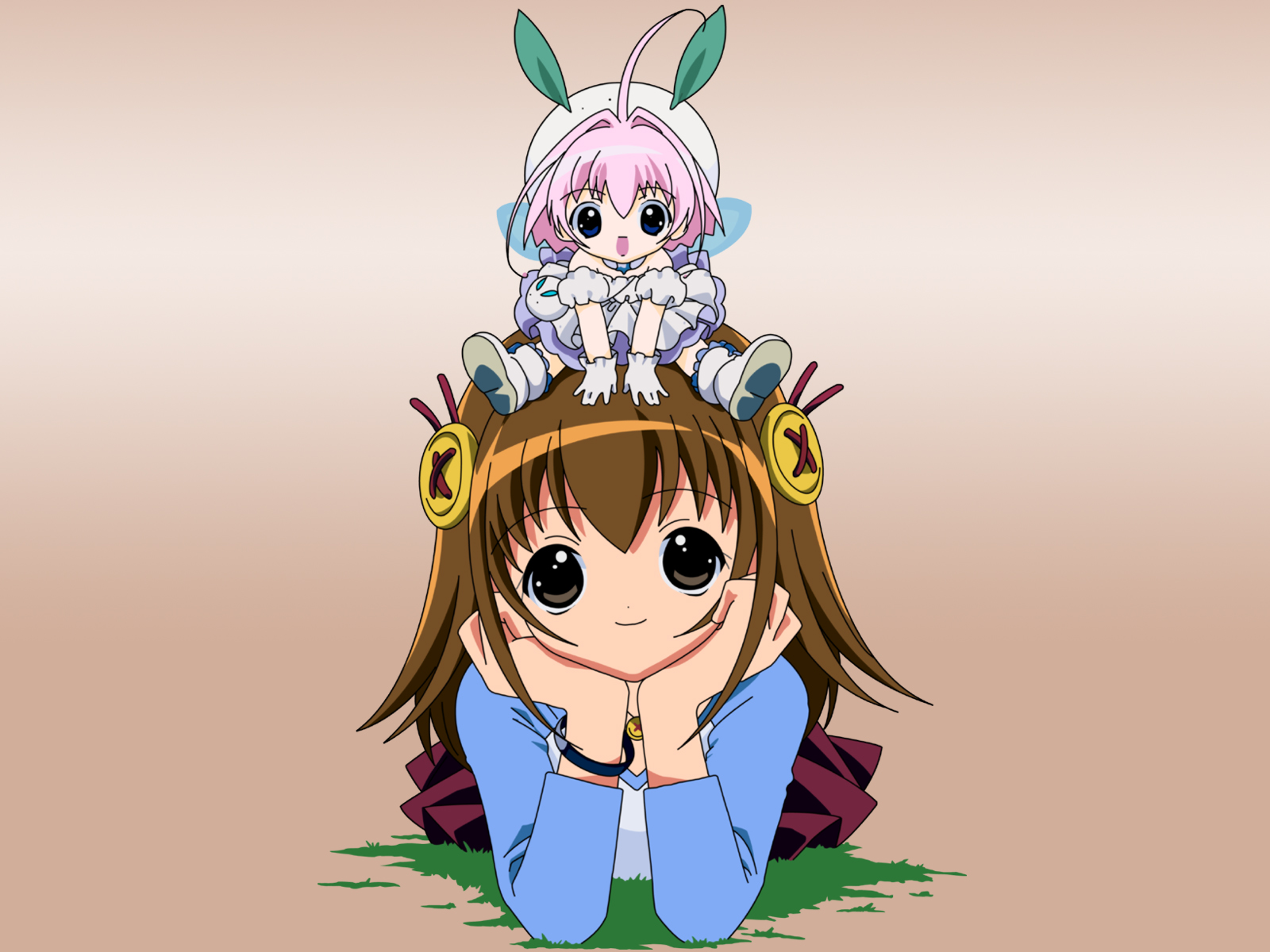 Description: A girl with a bunny on her head sitting on top of another girl's head.