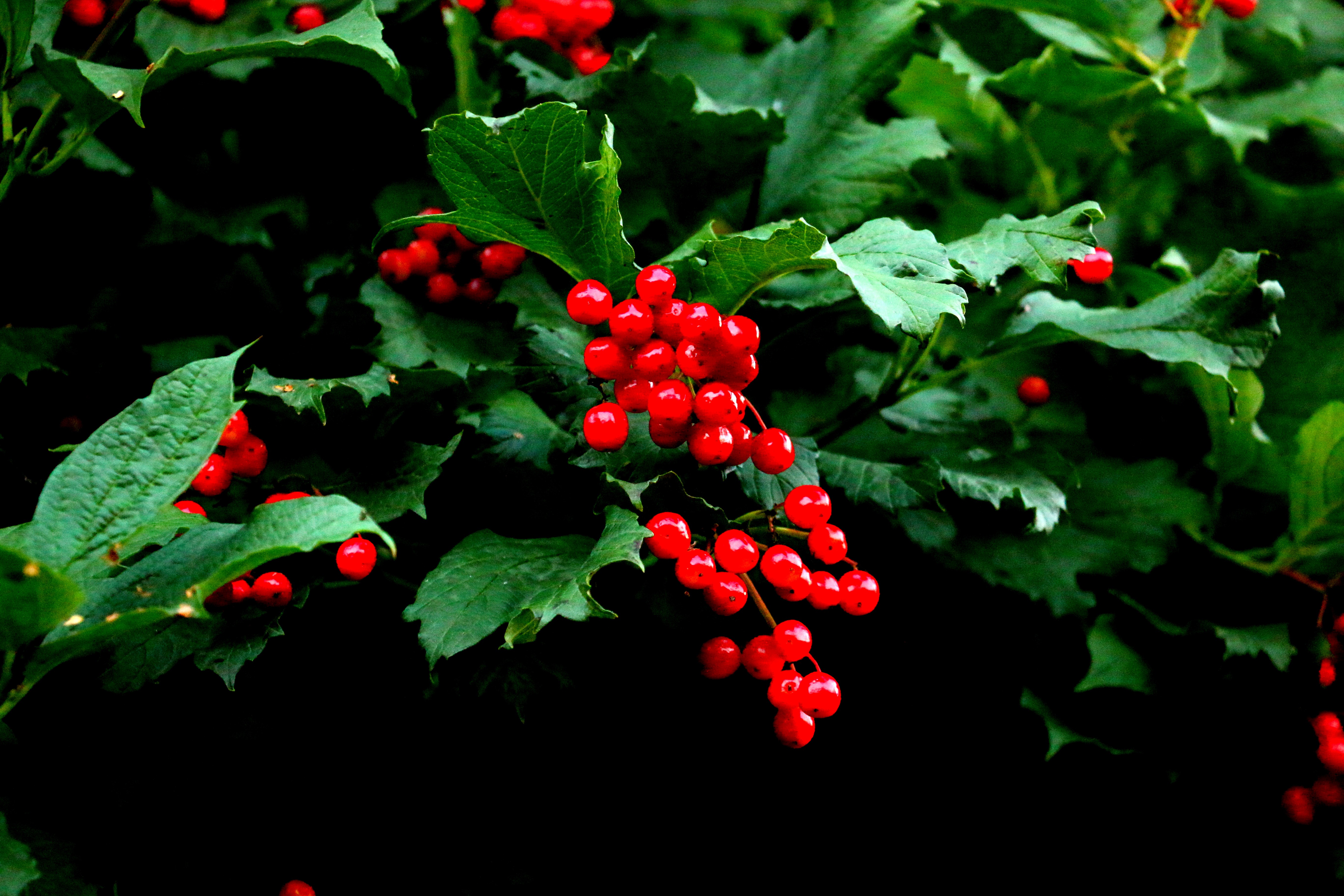 Description: A bush with red berries and green leaves on it's branches and a black background with a black background.