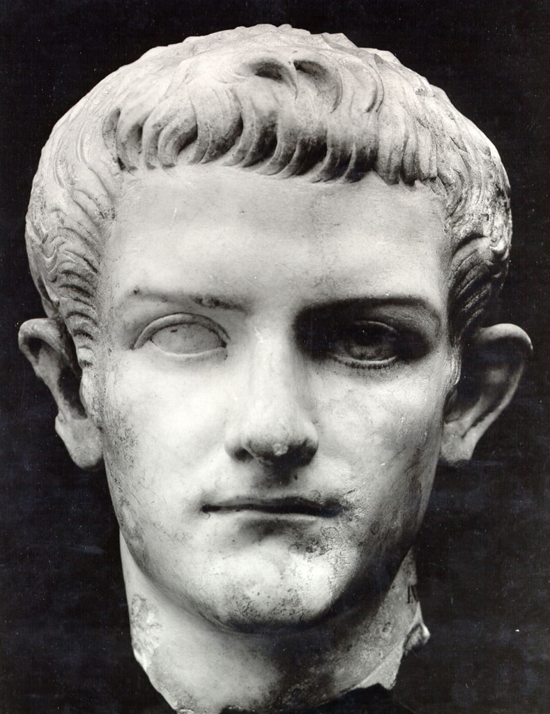 Description: A bust of a man with a tie on it's neck and a black background behind it.