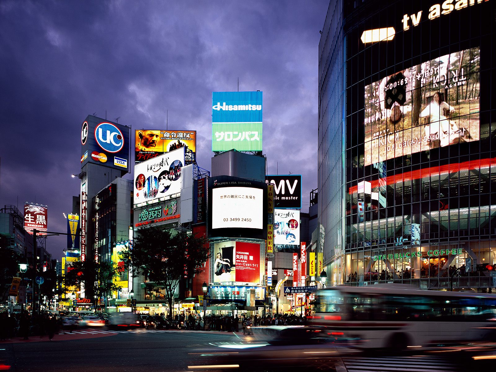 Description: A busy city street with a lot of tall buildings and billboards on the sides of it at night.