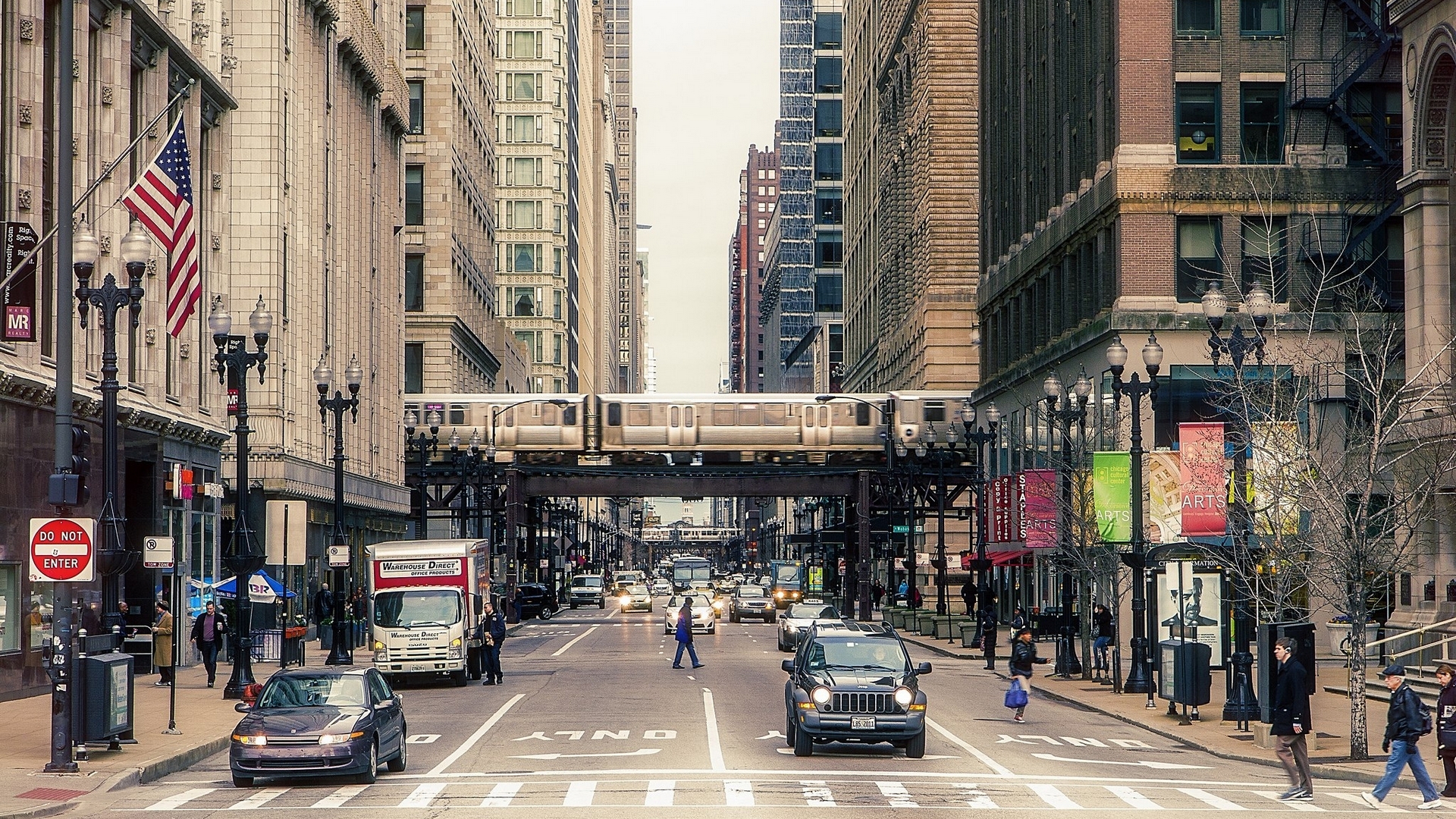 Description: A busy city street with a pedestrian crossing and a pedestrian crossing over the street in the middle of the street.