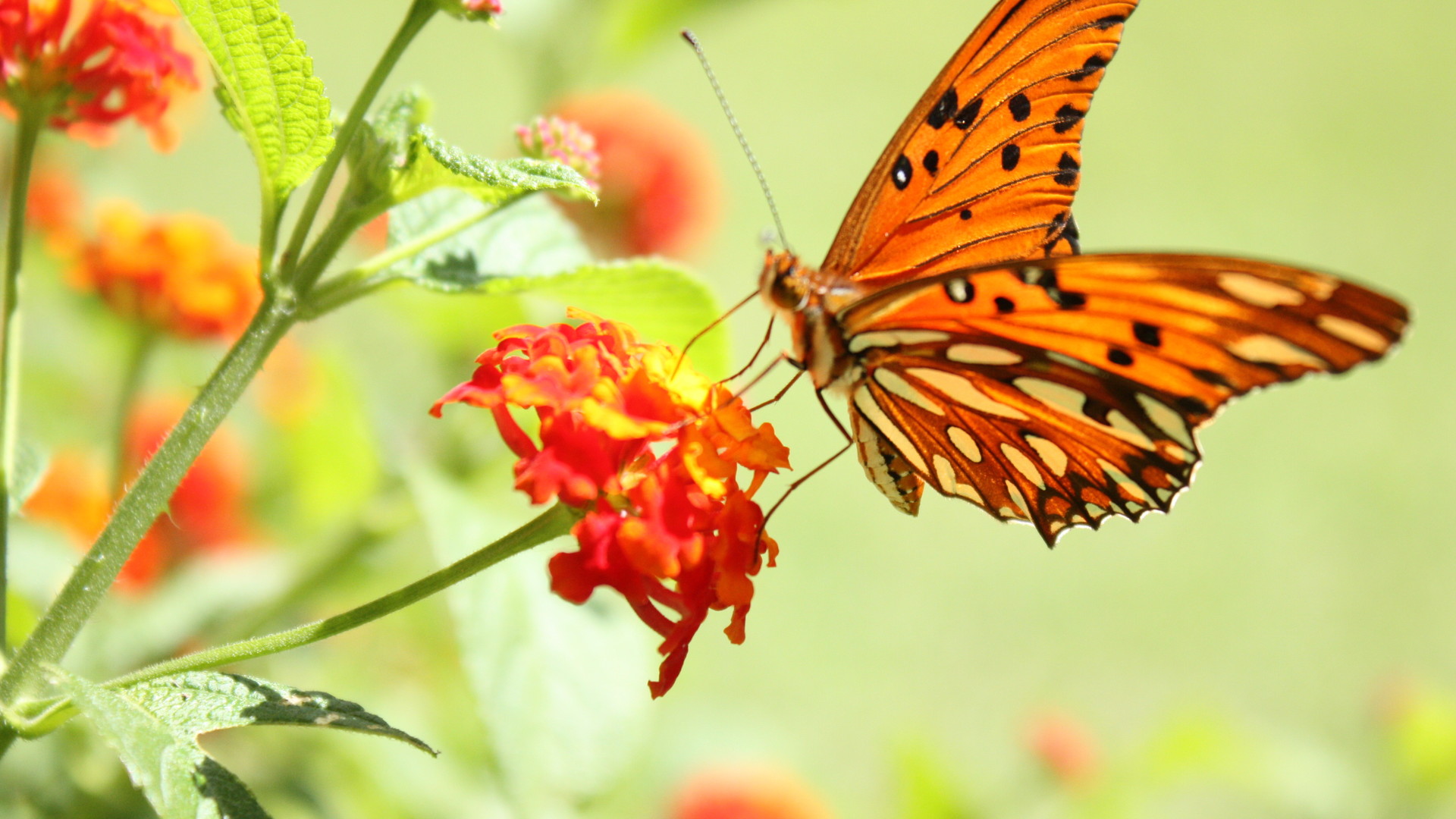 Description: A butterfly that is sitting on a flower in the grass and looking at the camera lens and the butterfly is on the flower.