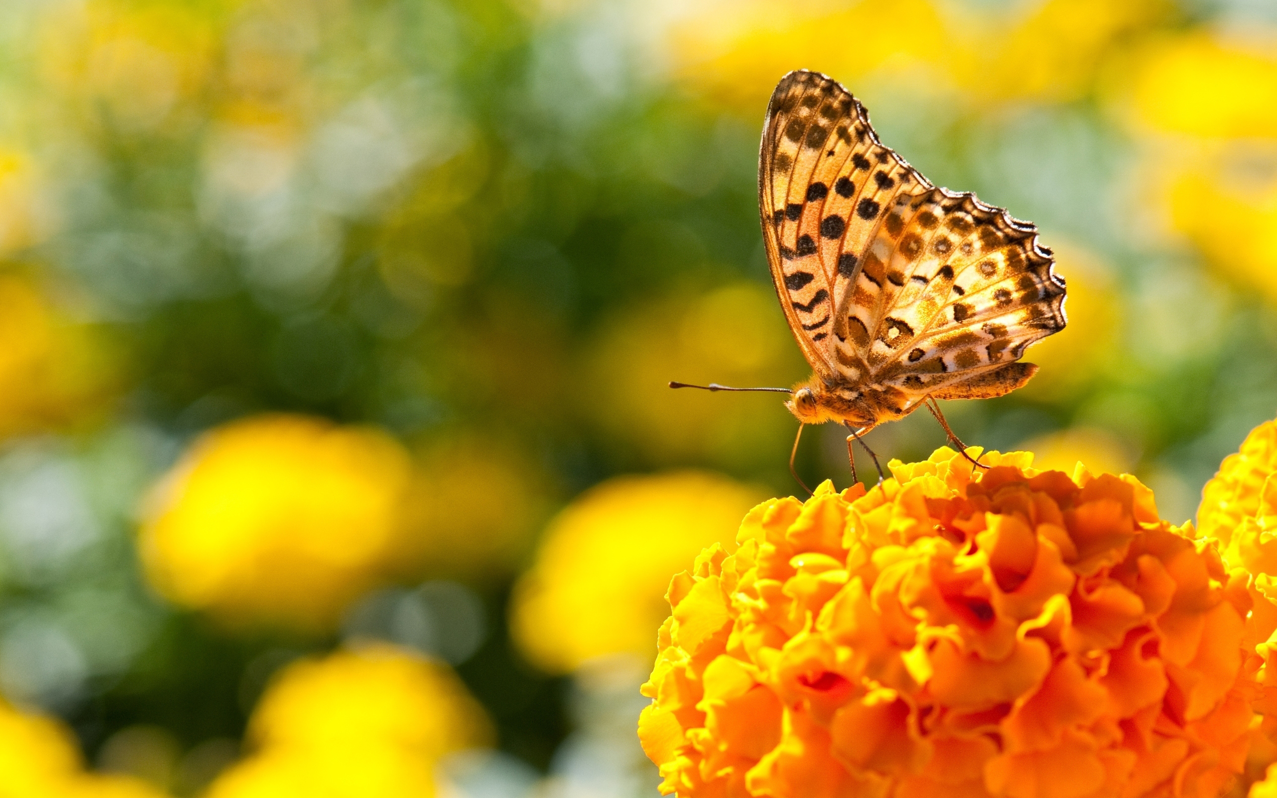 Description: A butterfly sitting on a flower in a field of yellow flowers with green leaves in the background and a blurry background.