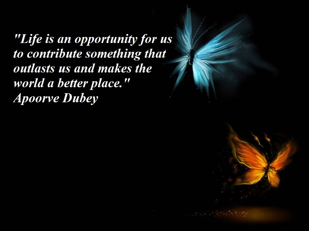 Description: A butterfly flying in the dark with a quote on it that says life is an opportunity for us to contrive something that contags us and makes the world a better place.