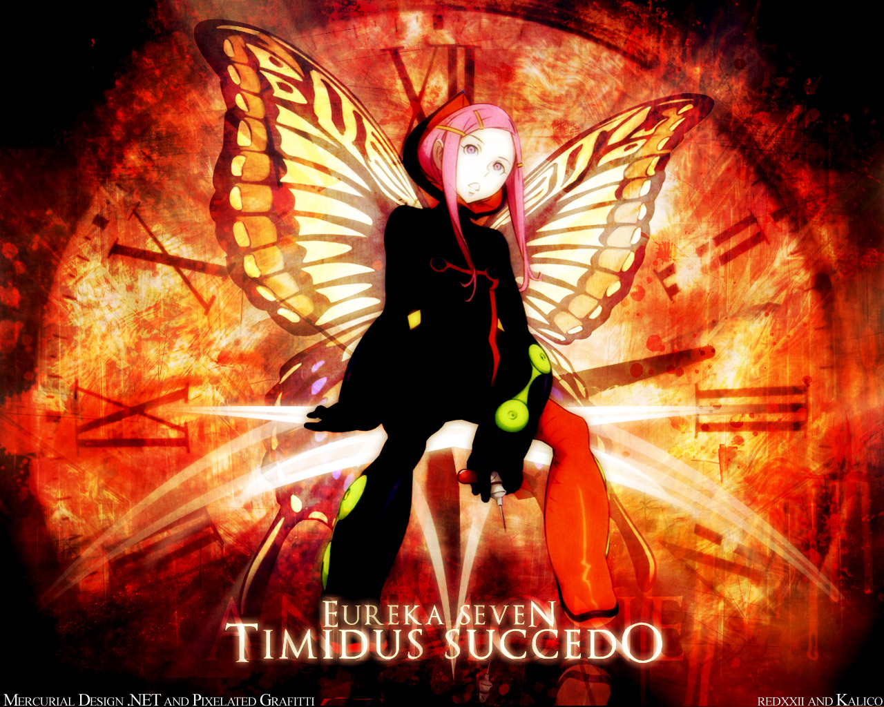 Description: A cartoon character with a butterfly wings on her back and a clock in the background with words fukkar haven timbus succeo.