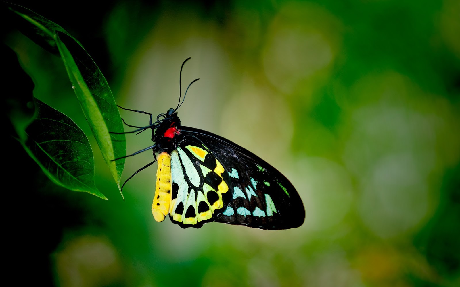 Description: A butterfly with a yellow and black wings on a green leaf with a black background and a red spot on the wing.