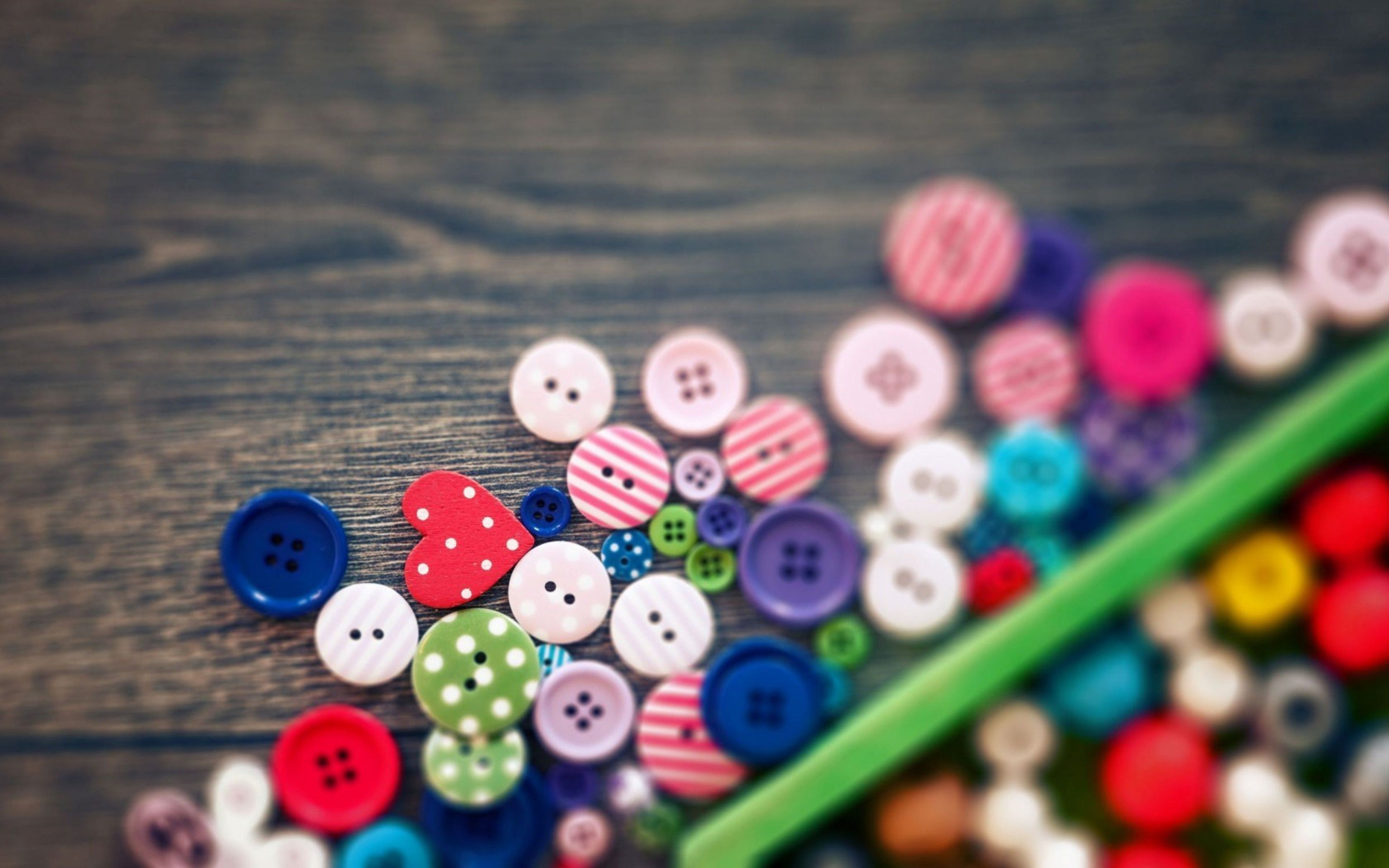 Description: A pile of buttons sitting on top of a wooden table next to a green pencil and a green marker.