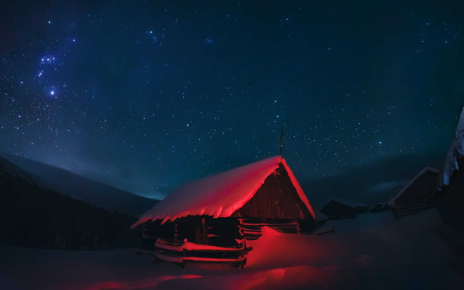 Description: A cabin in the snow with a night sky full of stars above it and a red light on the roof.