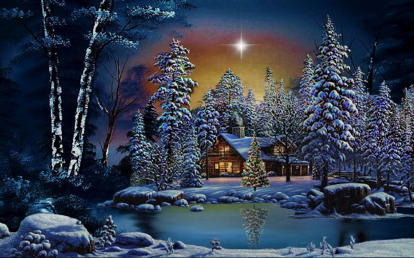 Description: A painting of a cabin in the woods at night with a star above the cabin and a pond in the foreground.