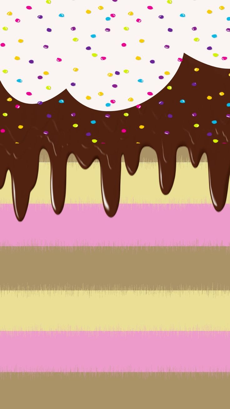 Description: A cake with chocolate frosting and sprinkles on a striped background with a pink and yellow stripe.