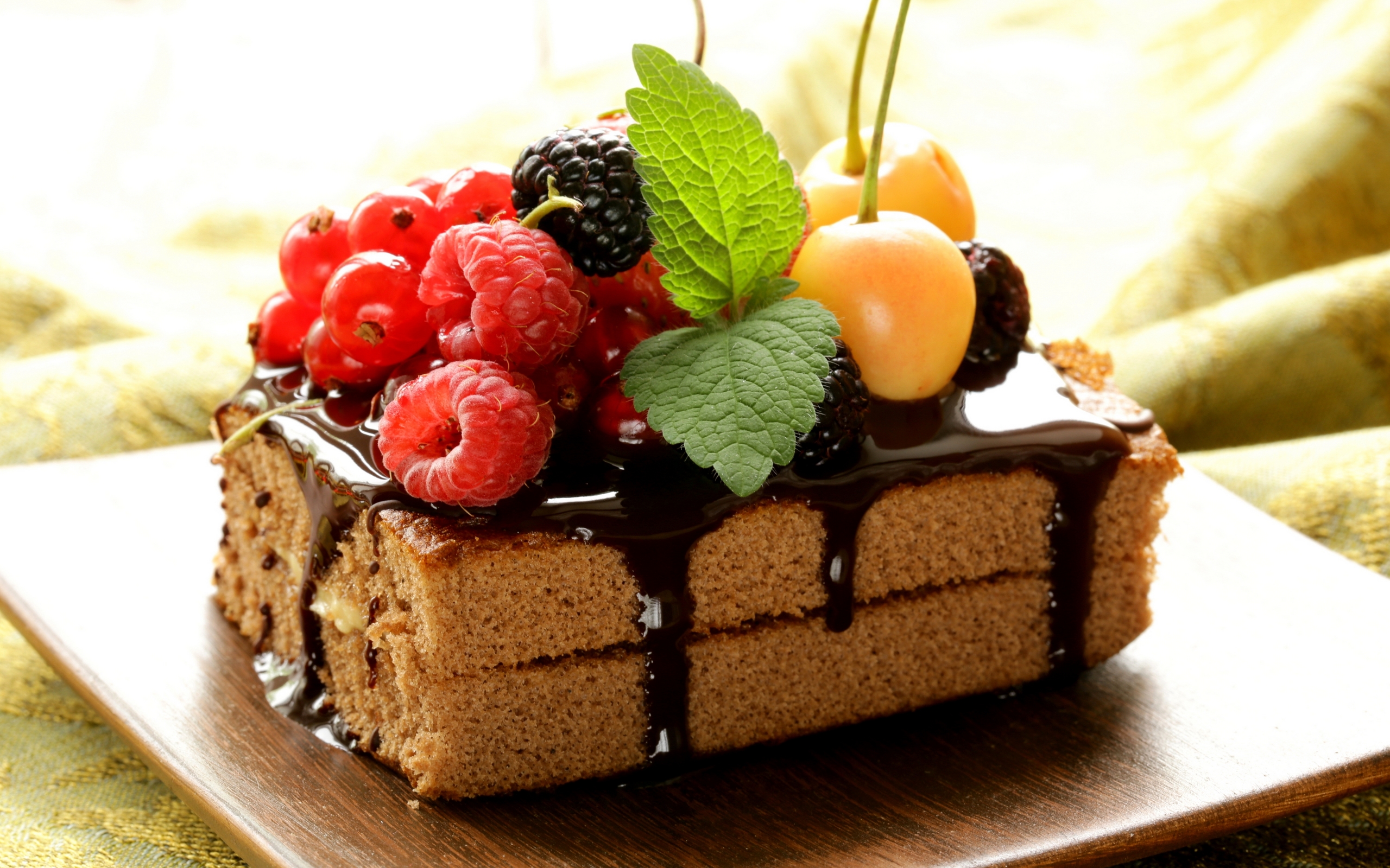 Description: A piece of cake with chocolate icing and fresh fruit on top of it on a plate on a bed.