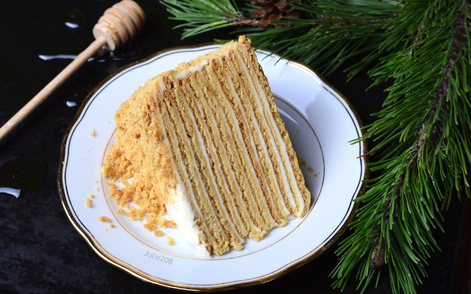 Description: A piece of cake on a plate with a fork and a pine branch in the background with a honey stick.