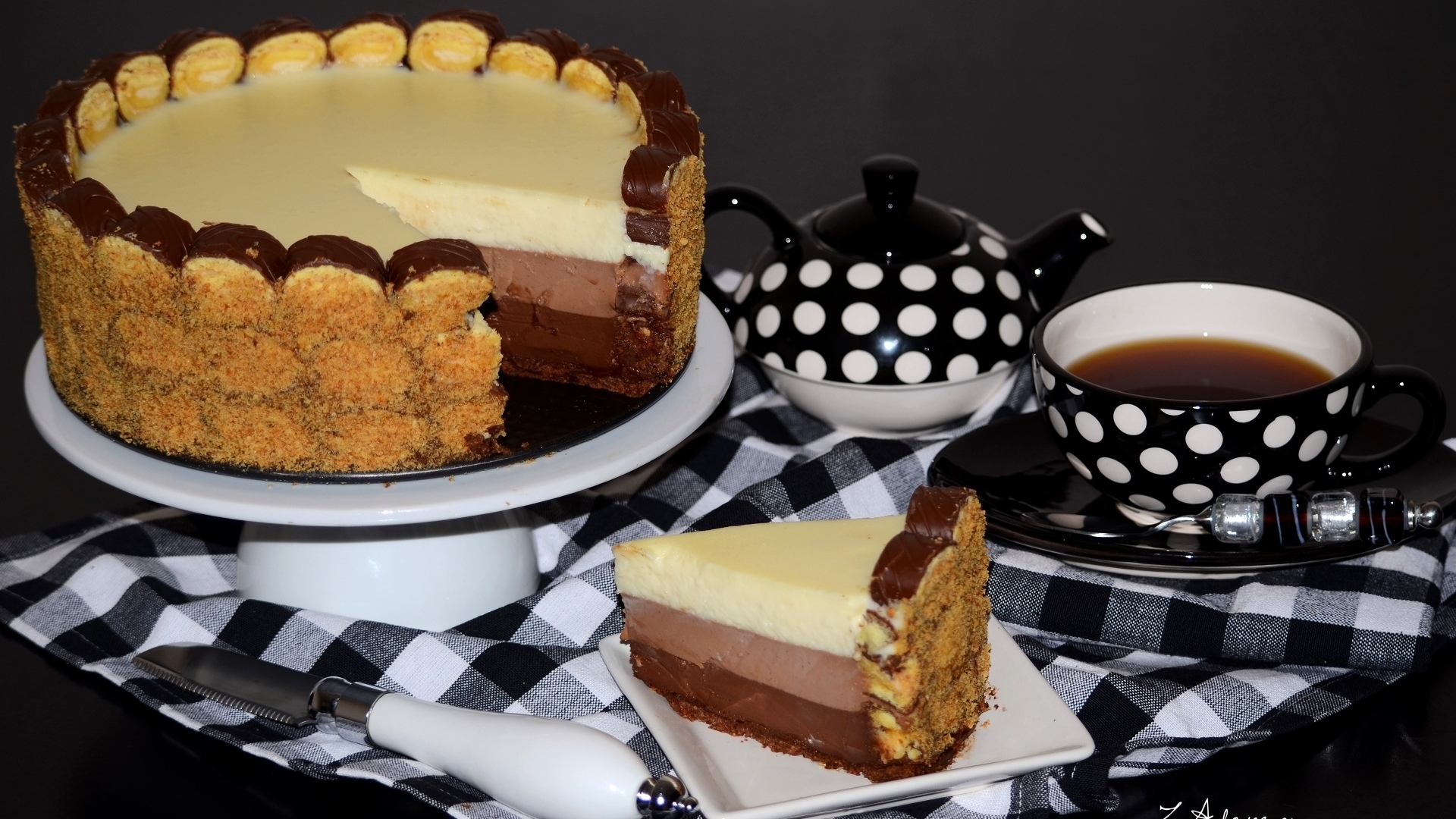Description: A cake with a slice missing from it on a plate next to a cup of tea and a black and white checkered napkin.