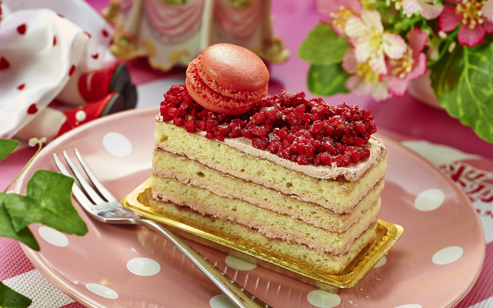 Description: A piece of cake with a strawberry on top of it on a plate with a fork and a cup of tea.