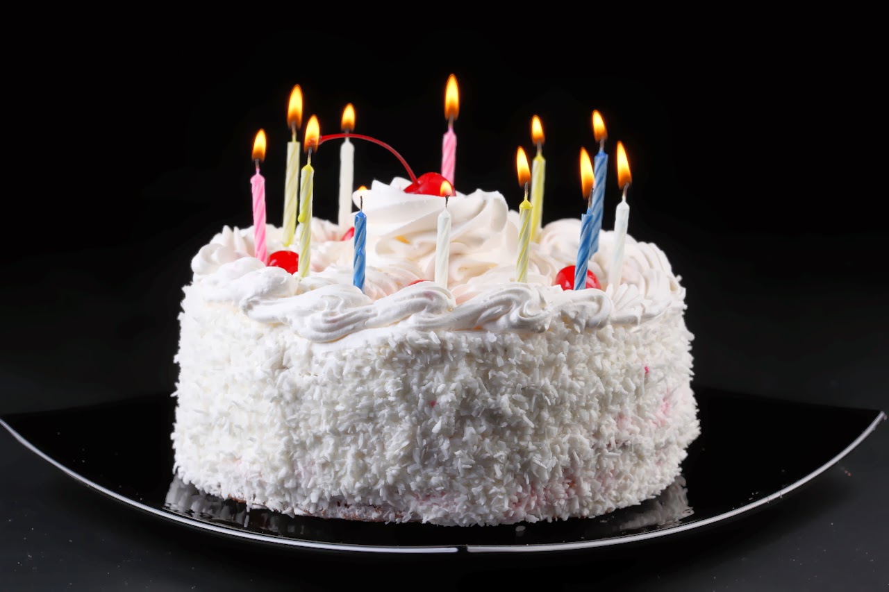 Description: A cake with white frosting and lit candles on a plate with a black background and a black plate with a black edge.