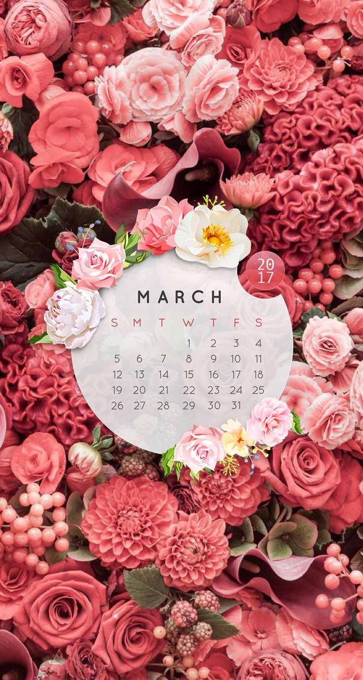 Description: A calendar with flowers on it and a white circle with the date march on it in front of a background of red and pink flowers.