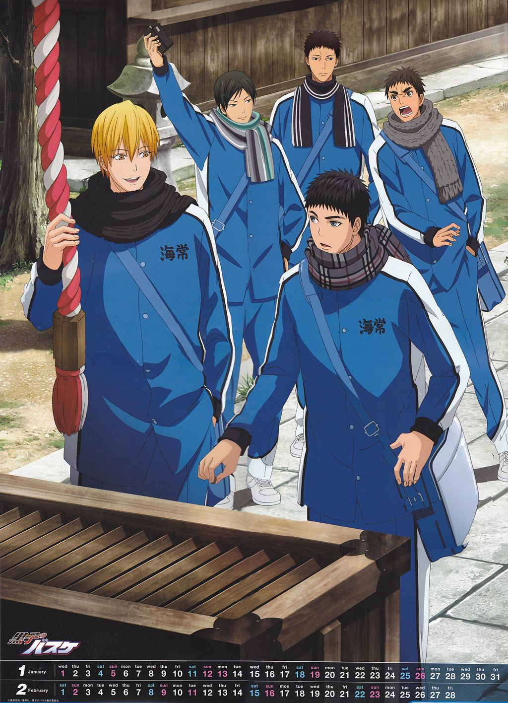 Description: A calendar with a group of people in blue outfits standing around a table with a candle in it and a clock in the background.