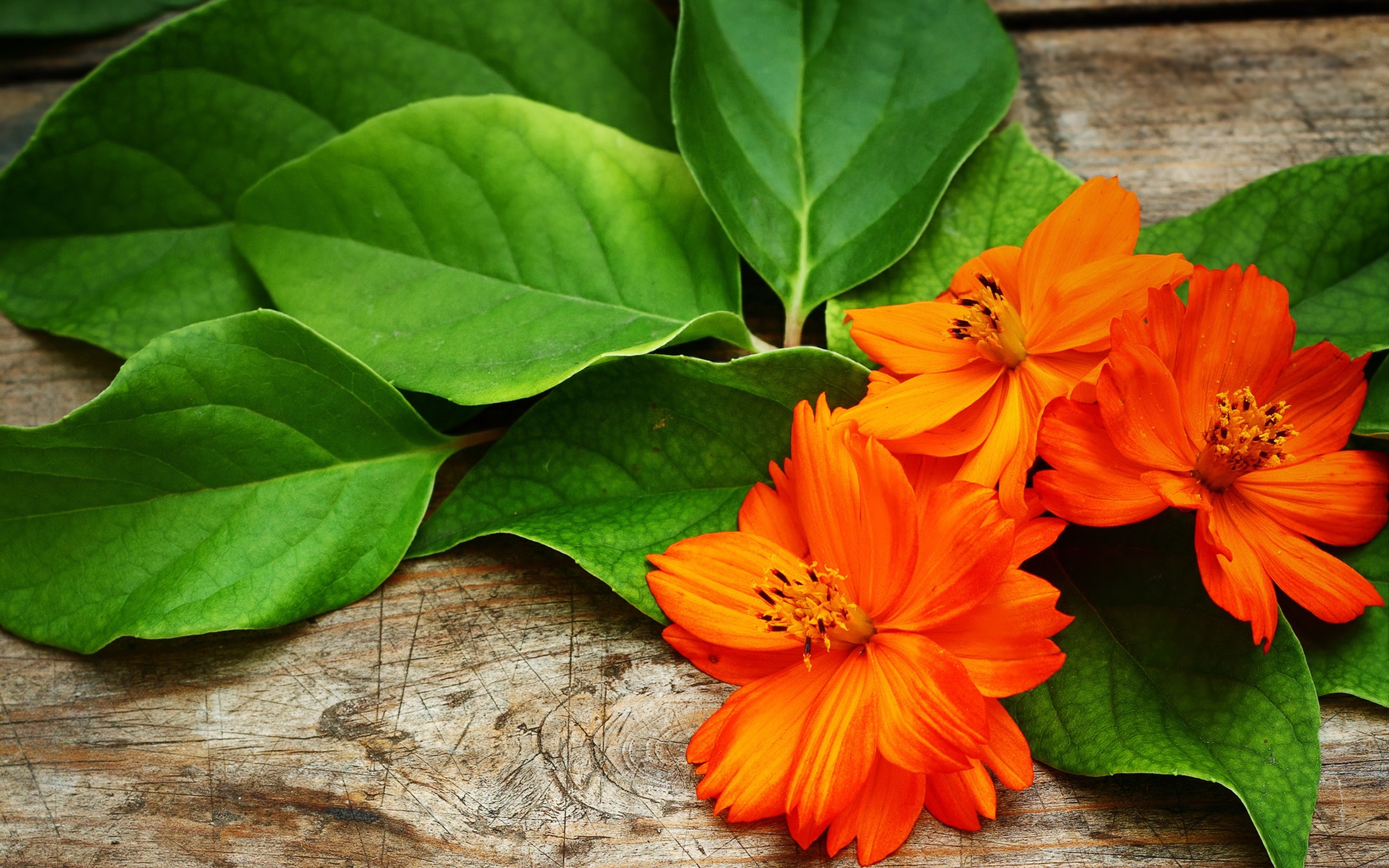 Description: A close up of a flower on a wooden surface with leaves around it and a wooden table with a wooden surface.