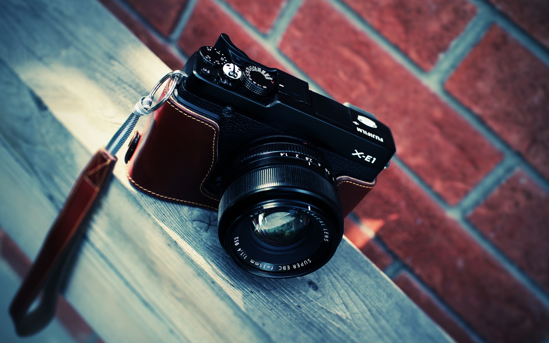 Description: A camera sitting on a table with a red brick wall behind it and a brown leather case on the side.