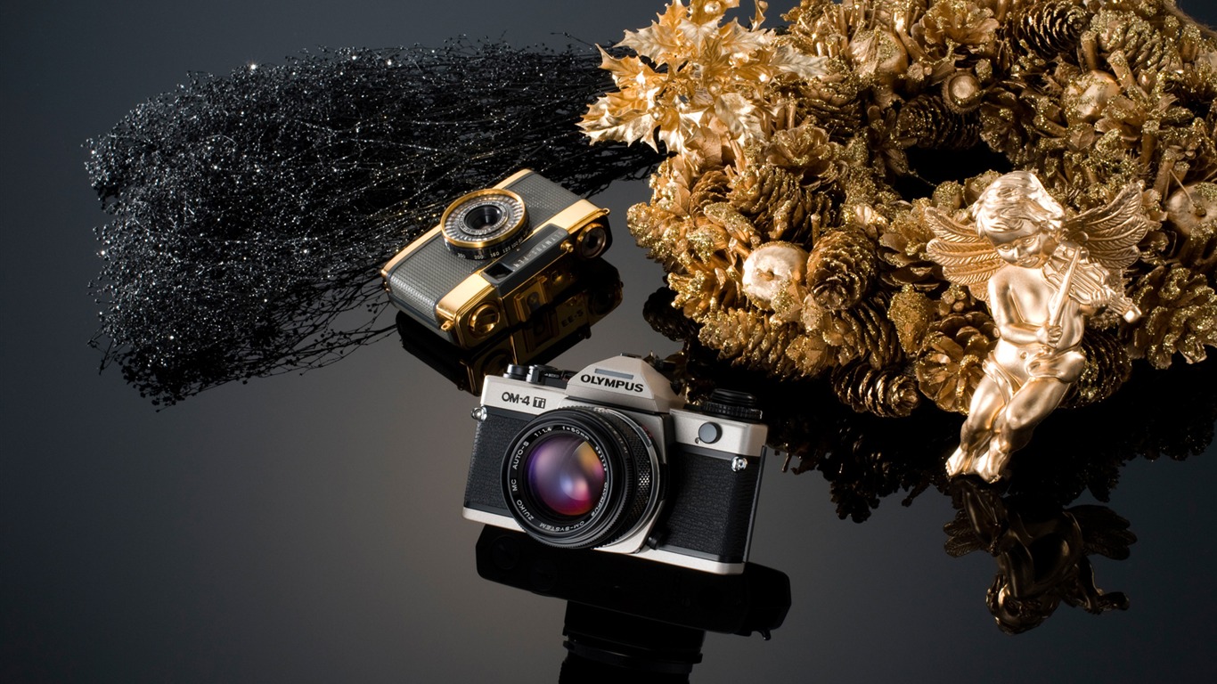 Description: A camera and a christmas wreath on a tripod with a flash camera attached to it and a black background.