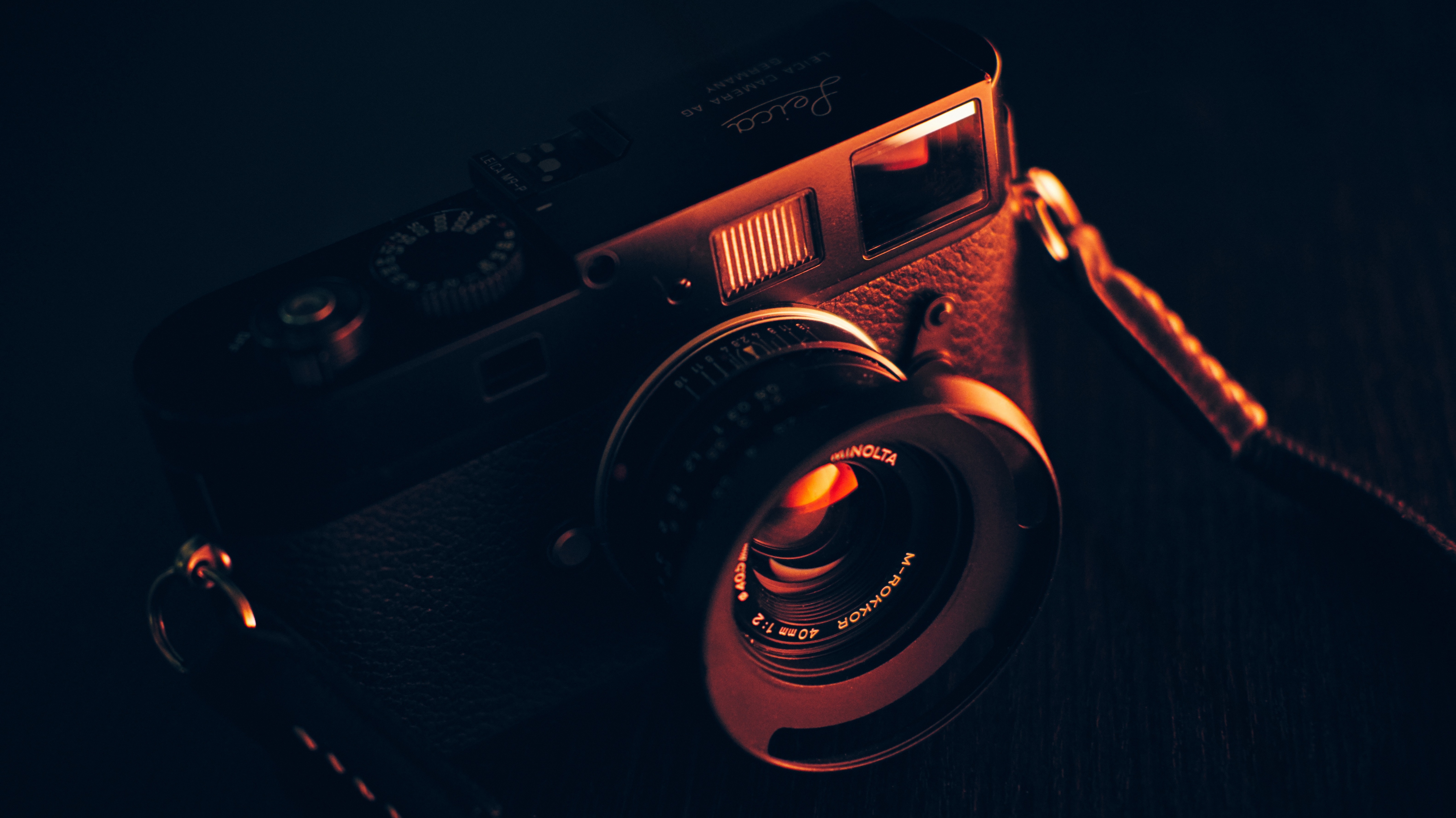 Description: A camera with a flash light on it sitting on a table next to a corded corded phone.