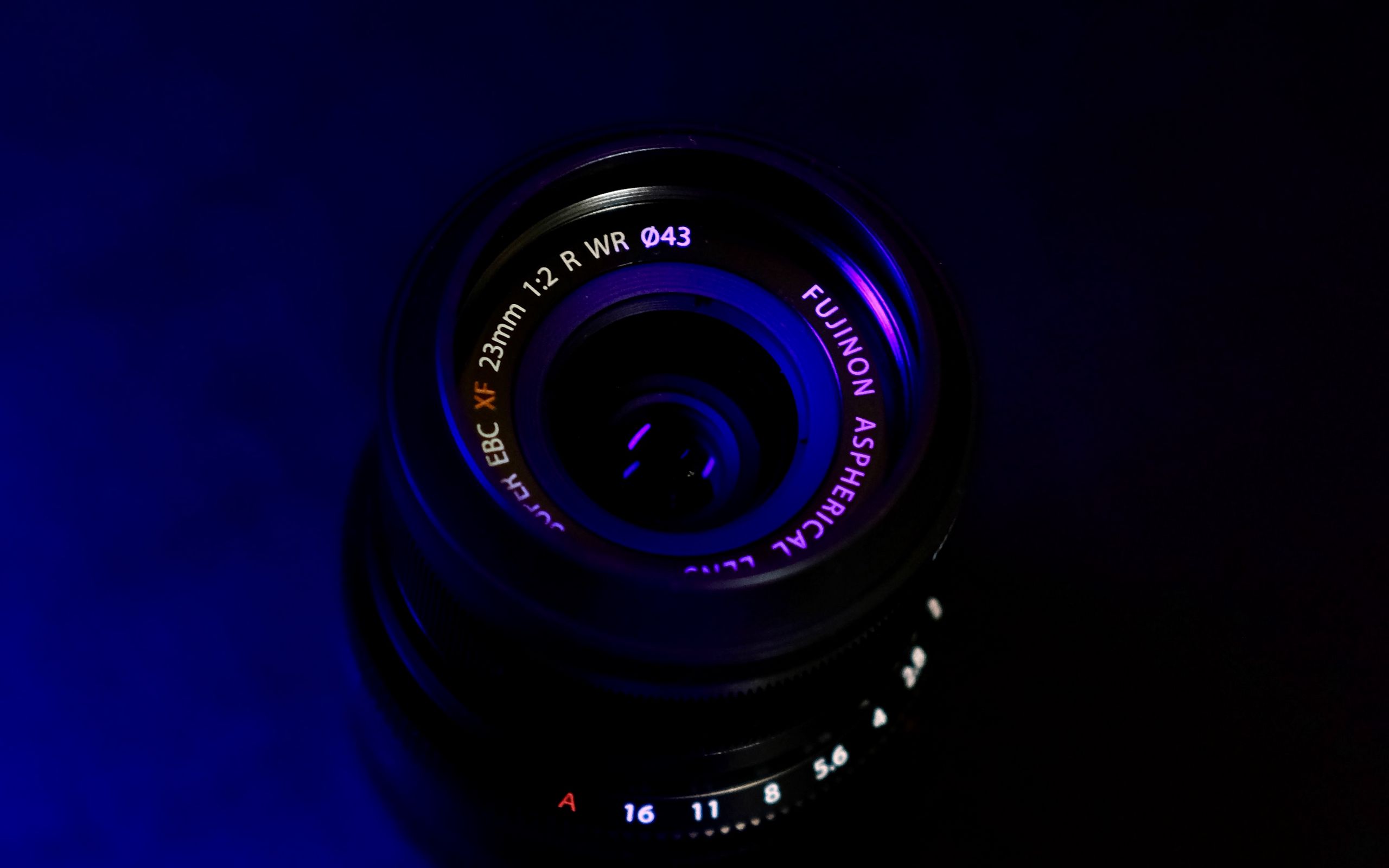 Description: A camera lens with a blue light in the background and a black background with a blue light in the middle.