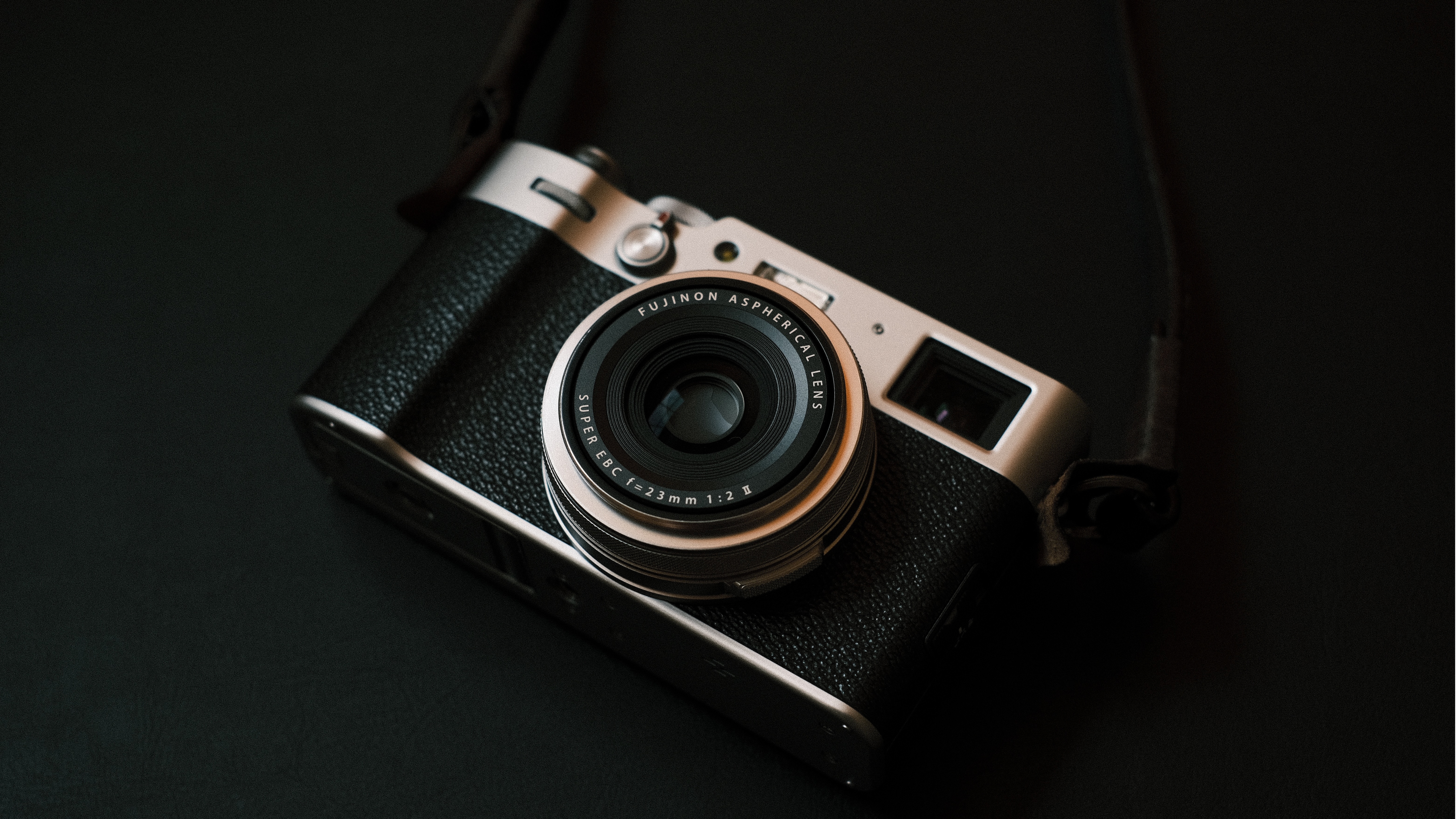 Description: A camera with a lens attached to it's body on a black surface with a black background and a black strap.
