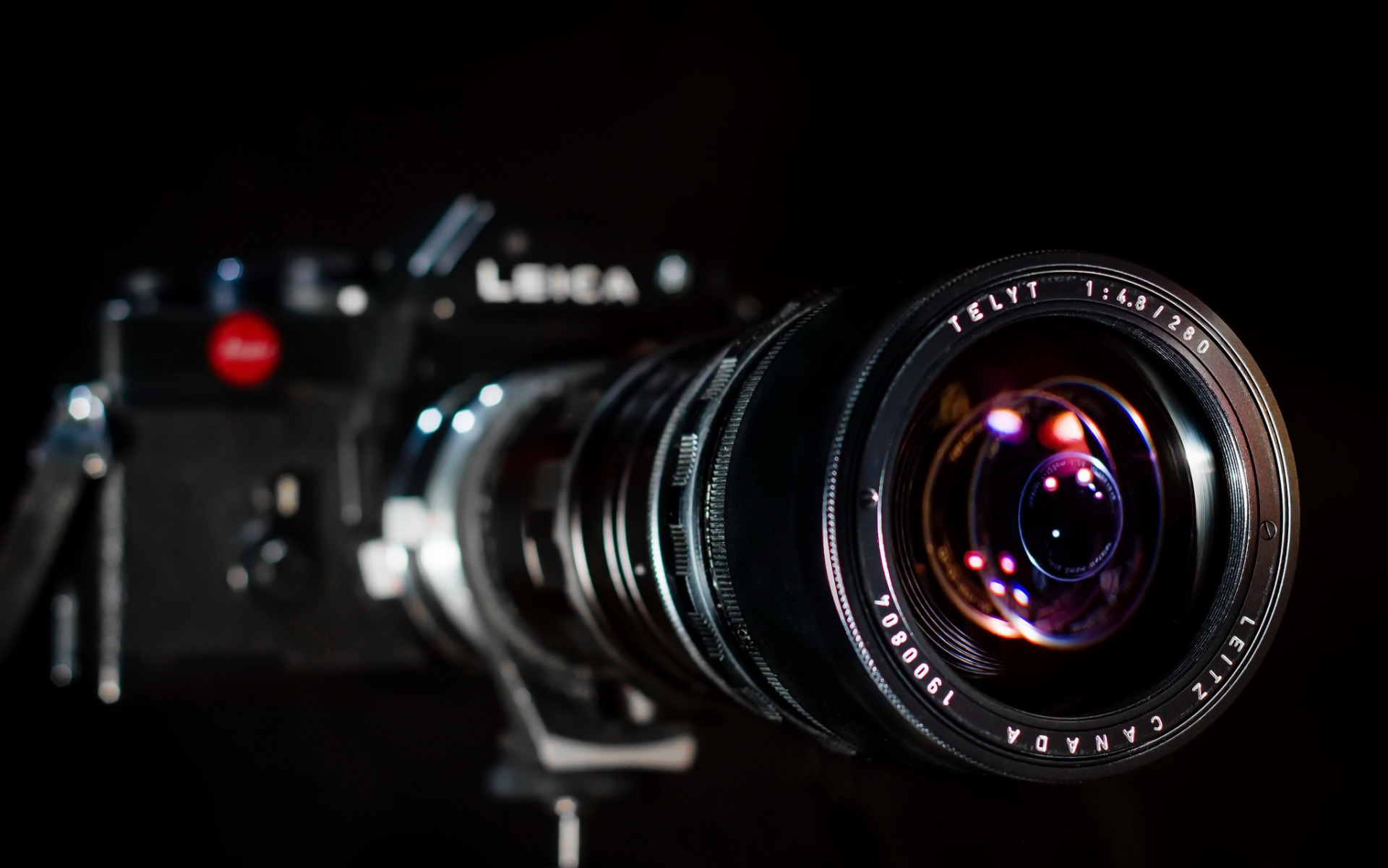 Description: A camera with a lens attached to it's body in the dark with a flash light on it.