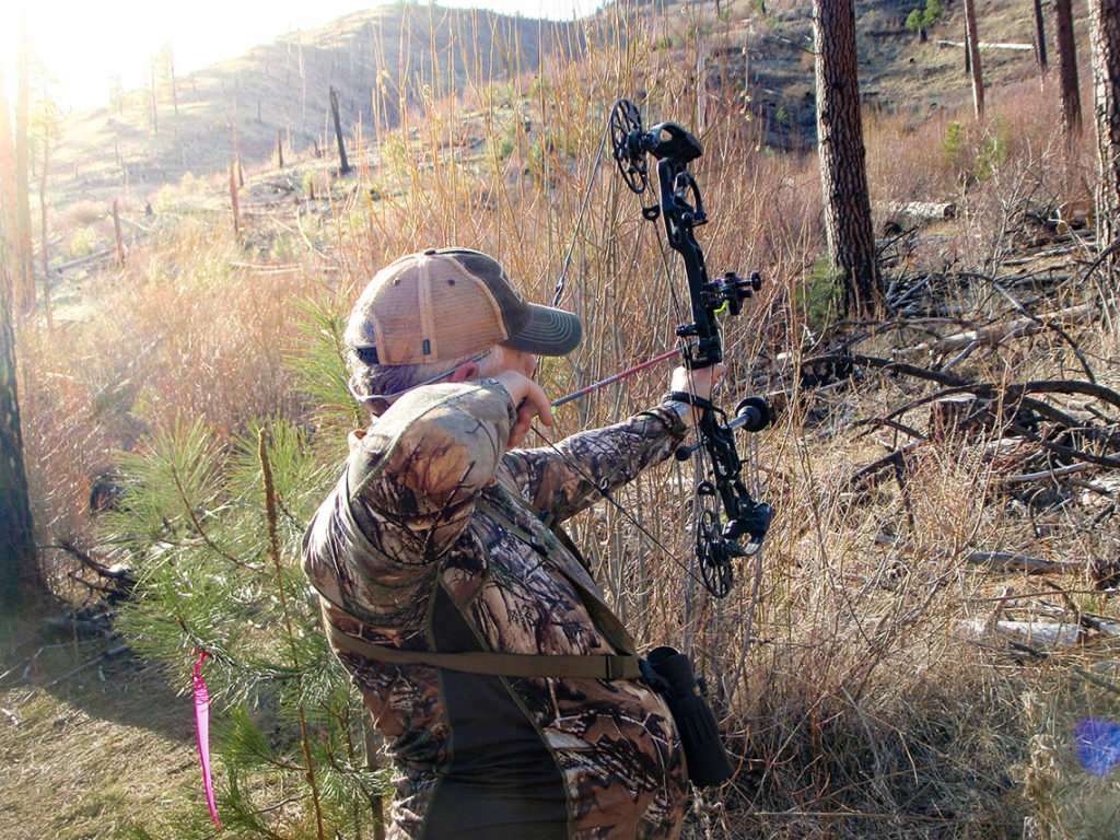 Description: A man in camouflage holding a bow and arrow in a wooded area with trees and bushes in the background.