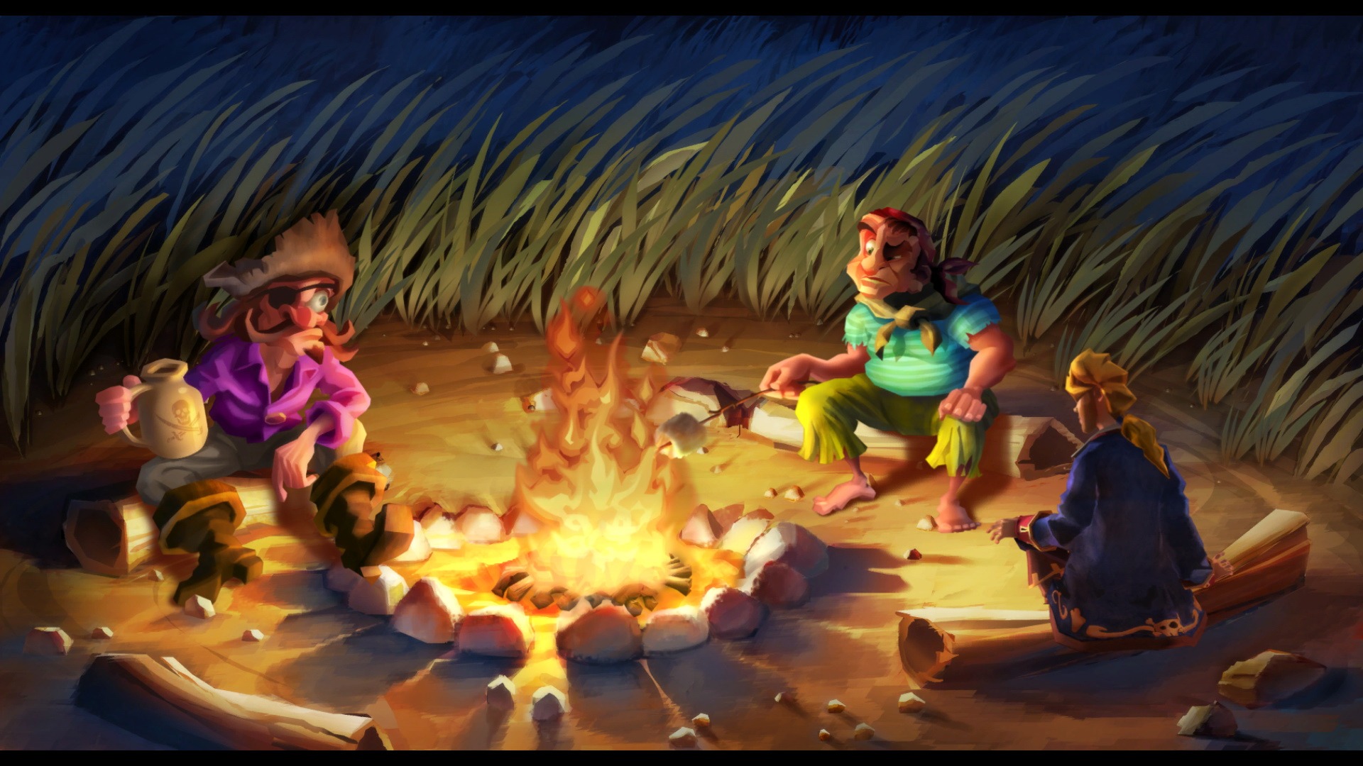 Description: A painting of two people sitting around a campfire with marsh grass in the background and a fire pit in the foreground.