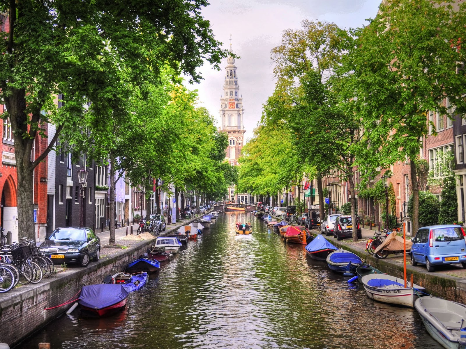 Description: A canal with boats and parked cars on it and a church steeple in the background in the distance.