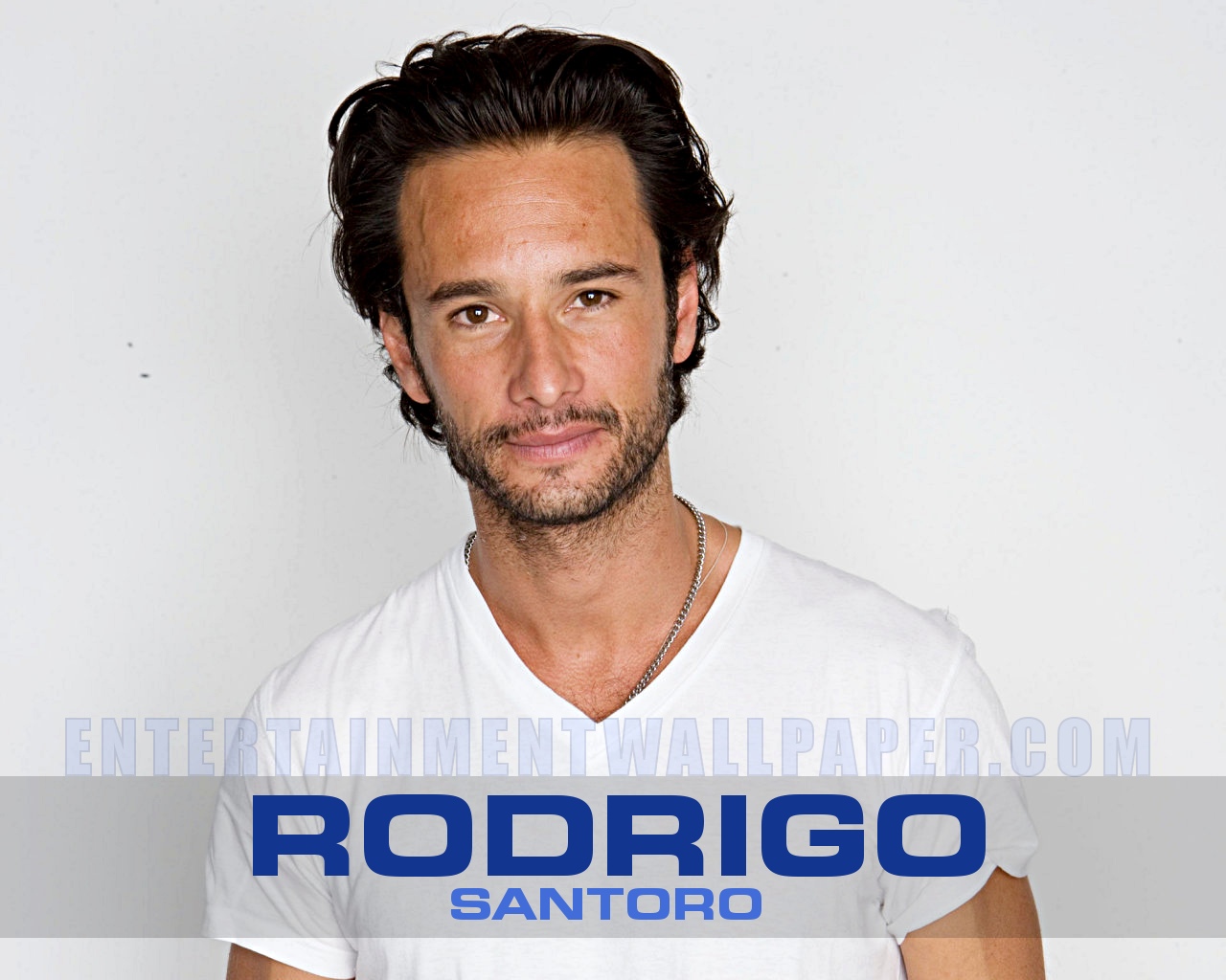 Description: A man in a white shirt is posing for a picture with a white background and a blue logo on the shirt.