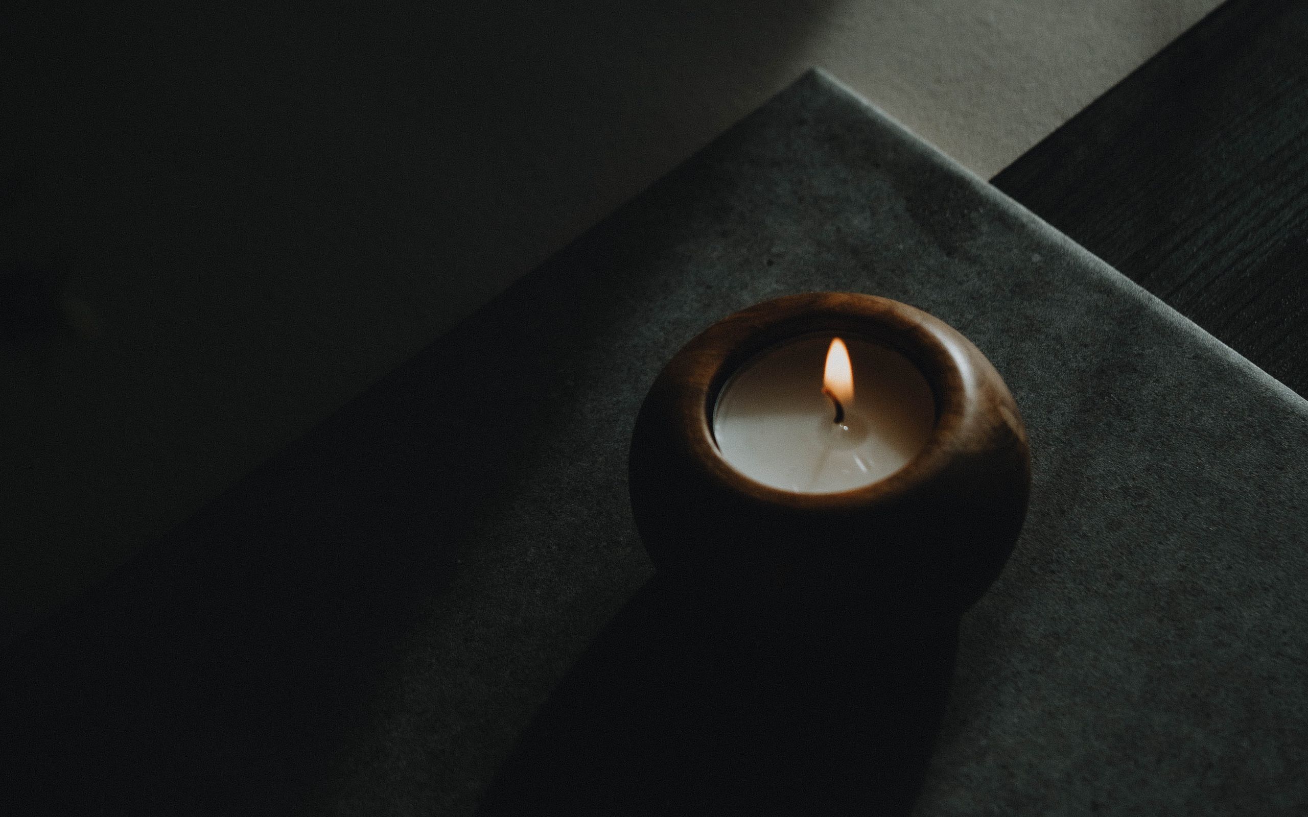 Description: A candle is lit on a table in the dark room of a house.