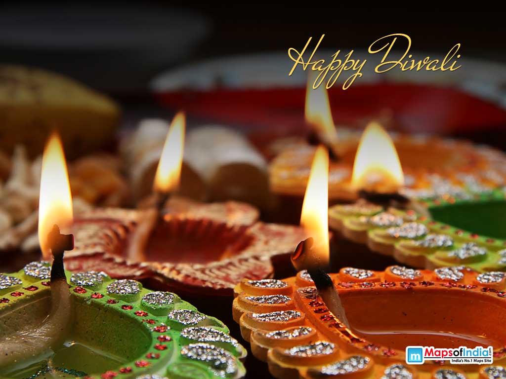 Description: A close up of a lit candle on a plate with other plates in the background and a happy diwali message.