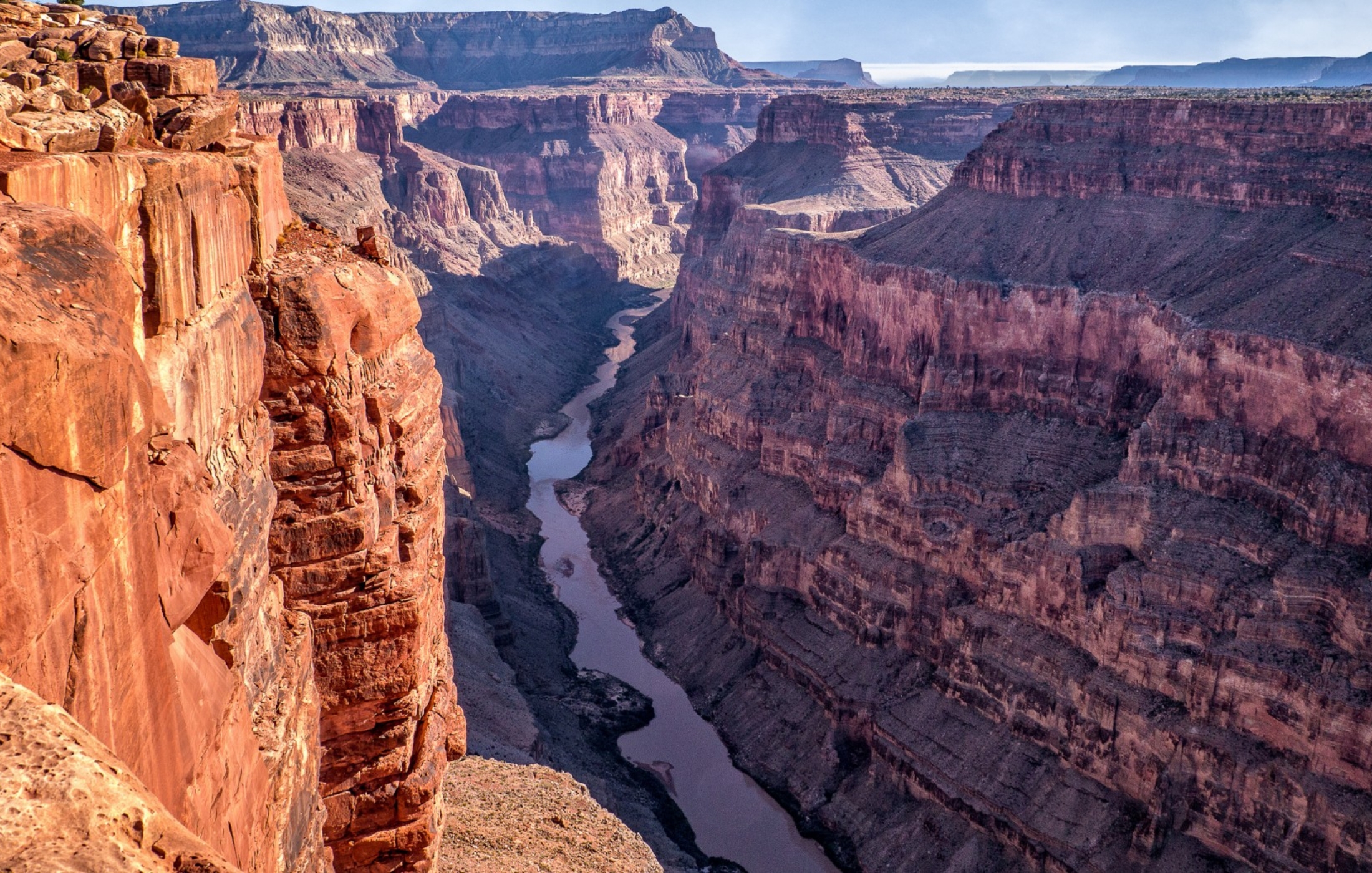 Description: A canyon with a river running through it and a cliff in the background with a sky line above it.