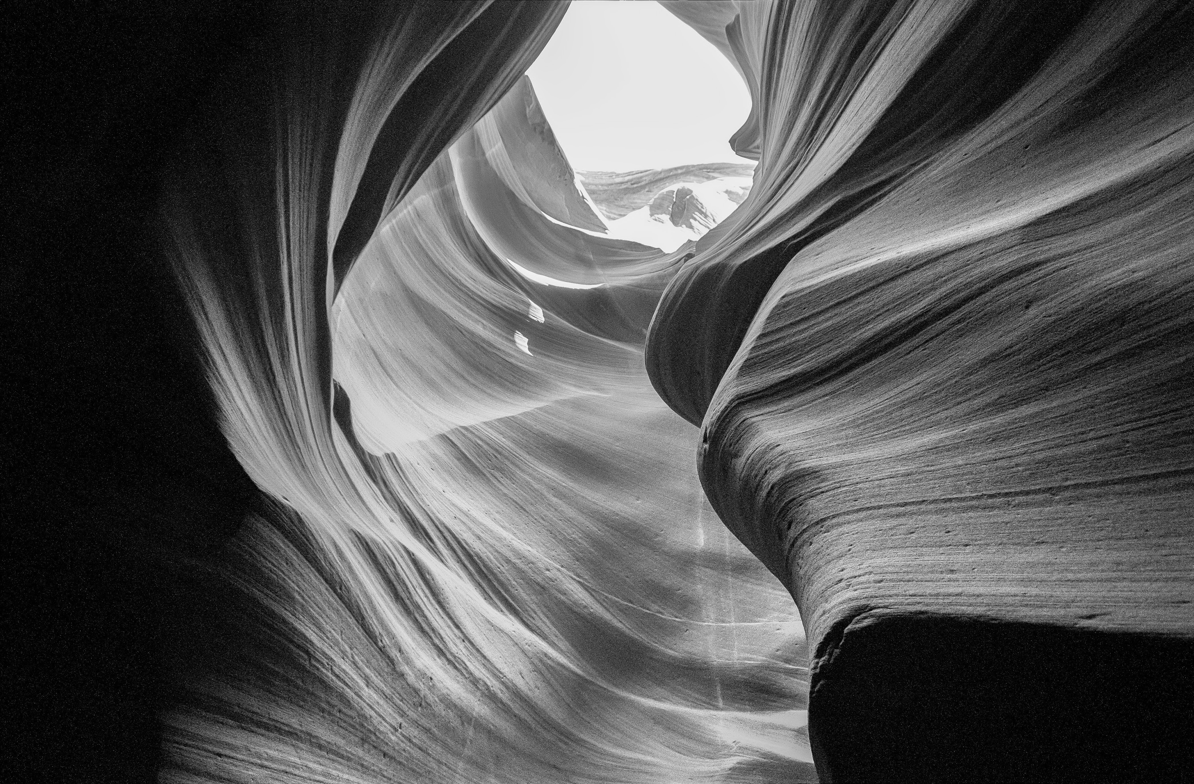 Description: A narrow slot in a canyon with a sky background and a person standing in the middle of the slot.