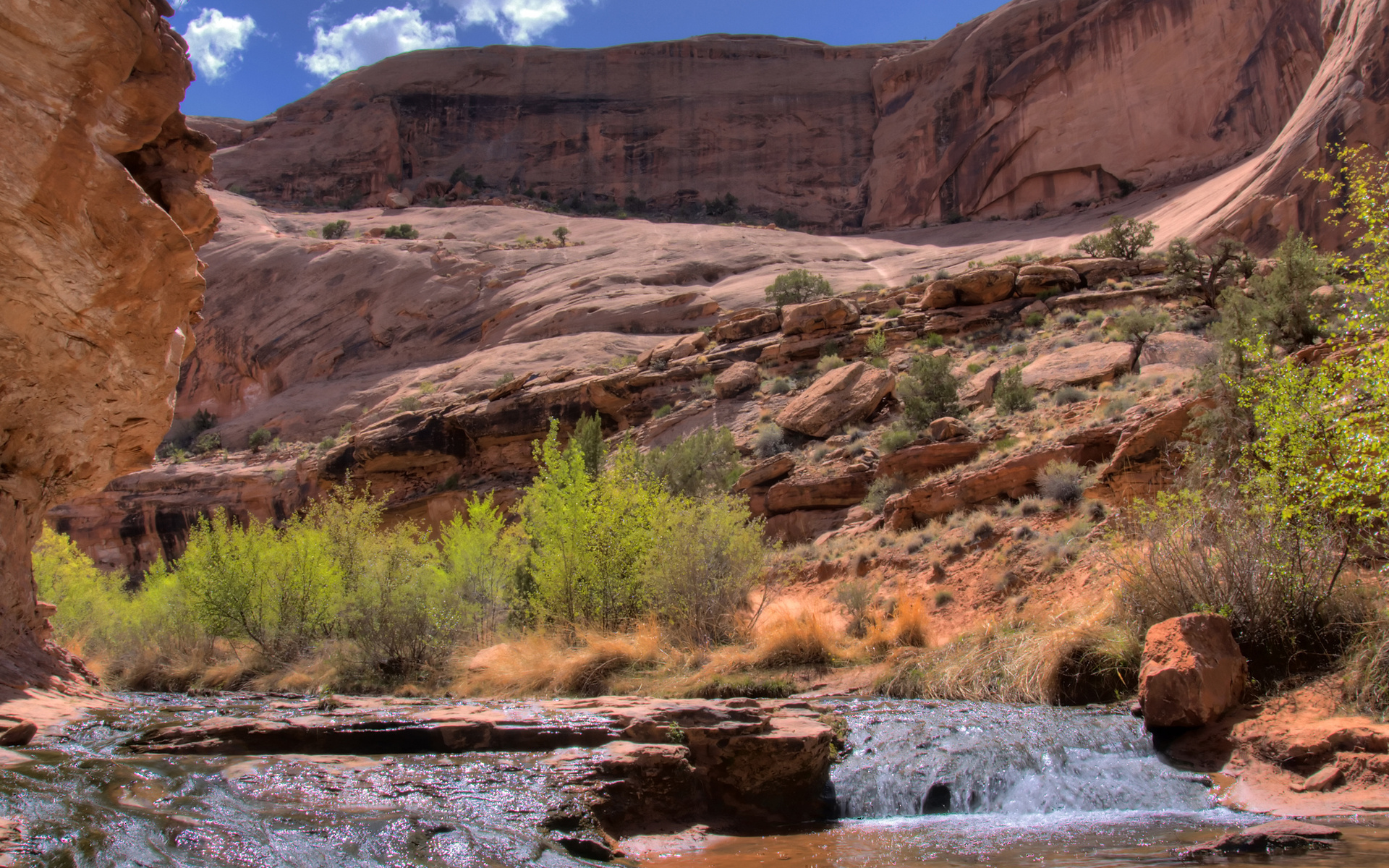 Description: A stream running through a canyon with a mountain in the background and a blue sky with clouds above it.