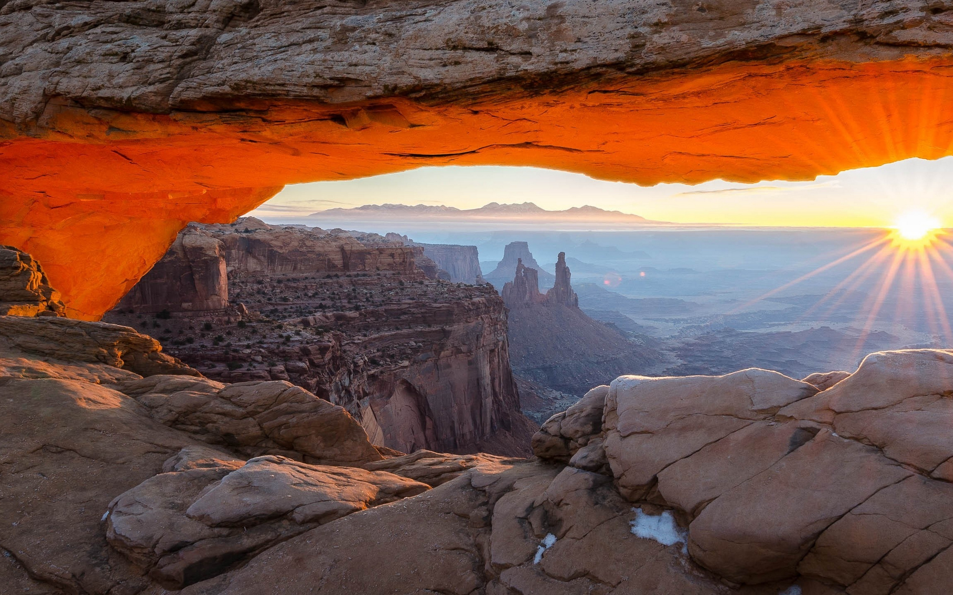 Description: A view of a canyon with a sun setting in the background and a rock formation in the foreground.