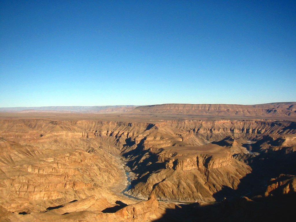Description: A view of a canyon from a plane window with a view of the mountains and the river below it.