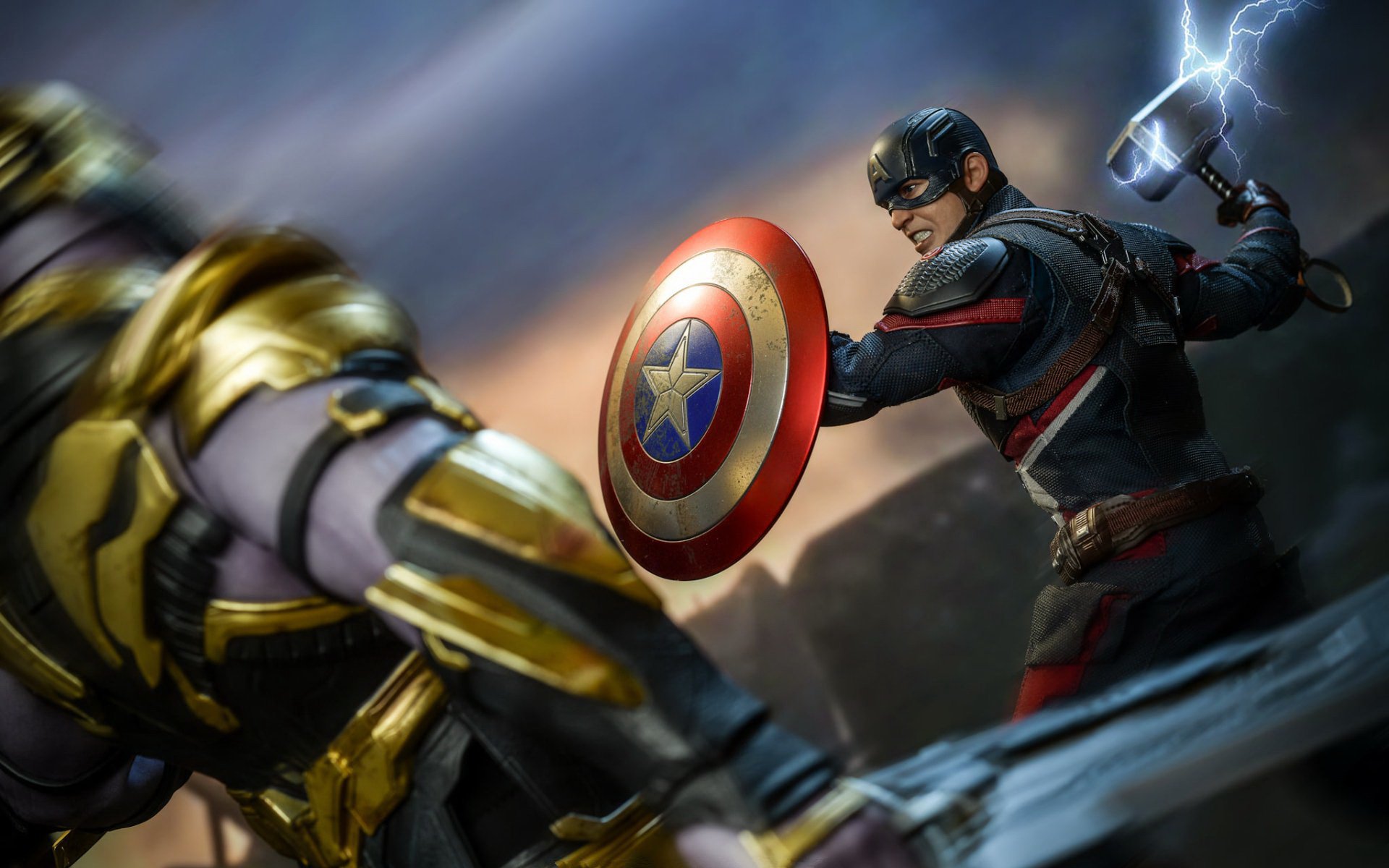 Description: A man in a captain america costume holding a shield and a sword in front of a man in a suit.