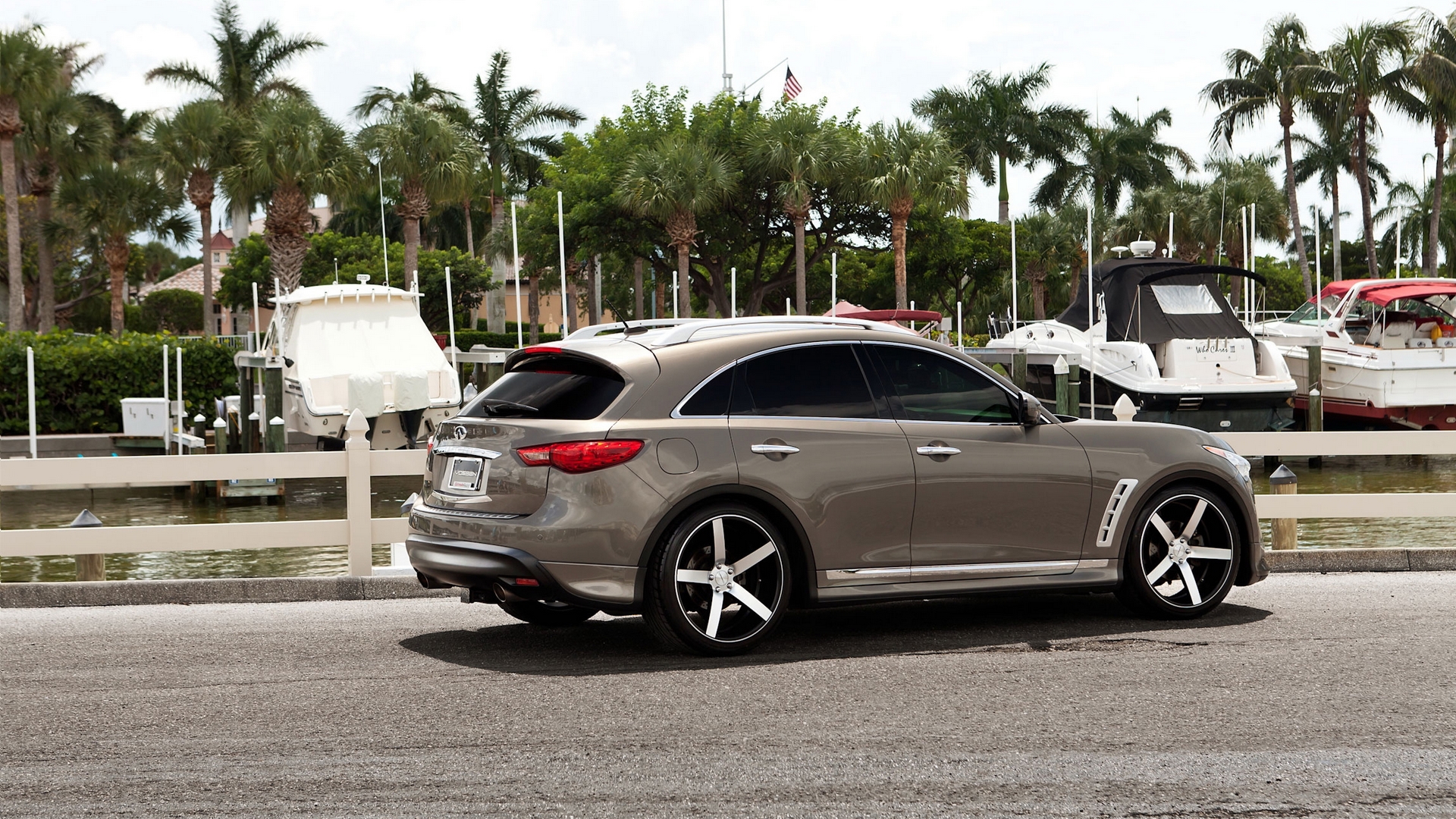 Description: A car parked on the side of a road near a boat dock and palm trees in the background with a boat in the water.