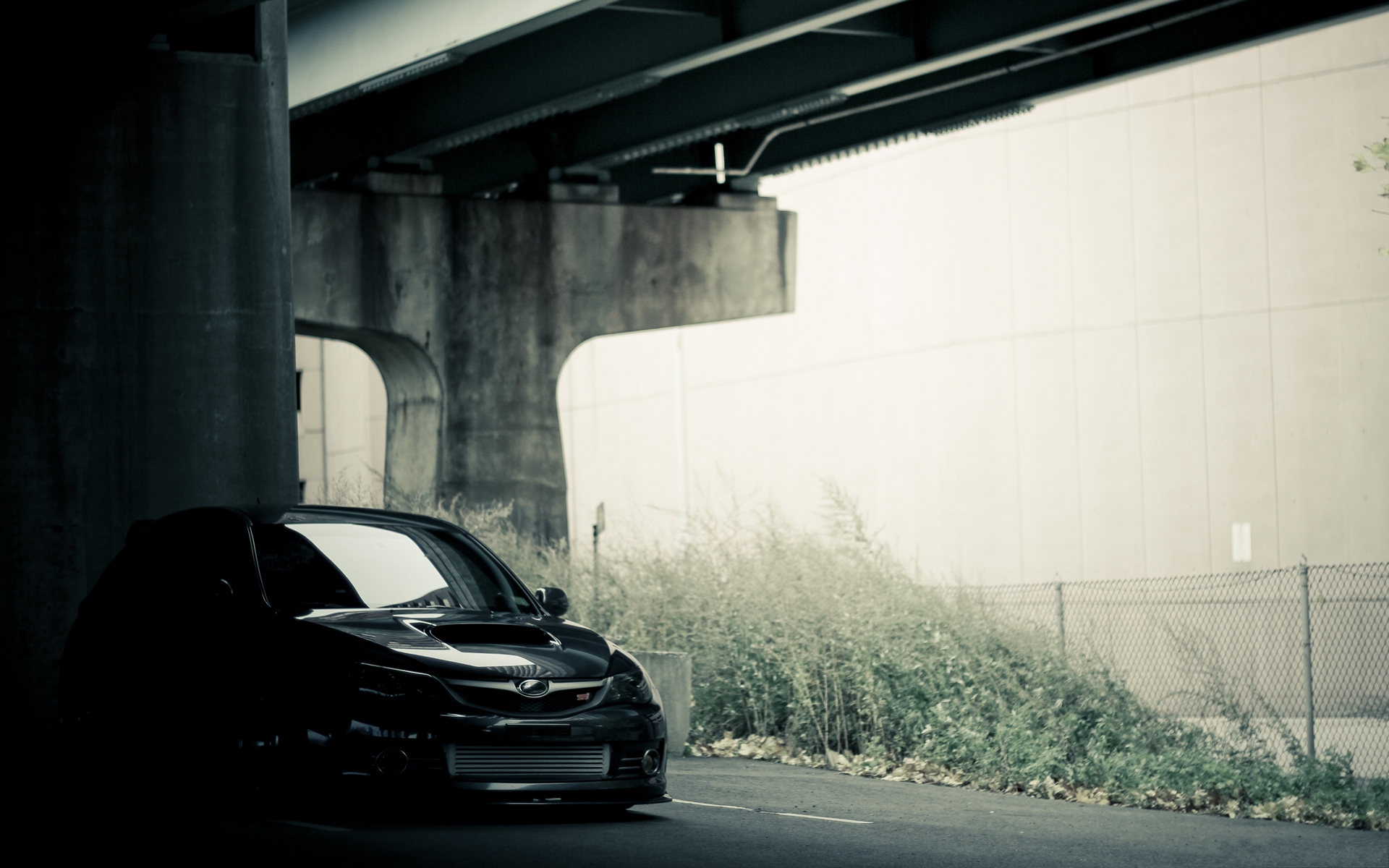 Description: A car parked on the side of a road under a bridge with a skylight above it and a building in the background.
