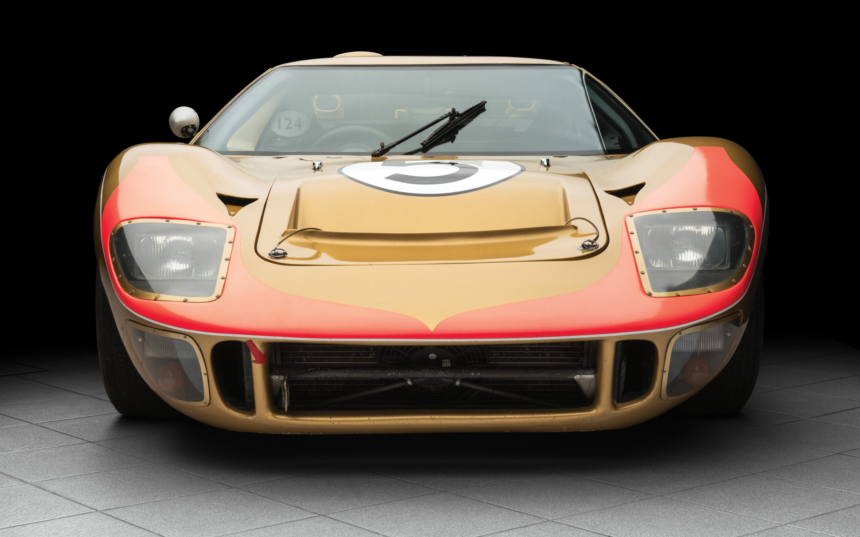 Description: A car with a clock on the front of it's hood is shown in a dark room with a tile floor.