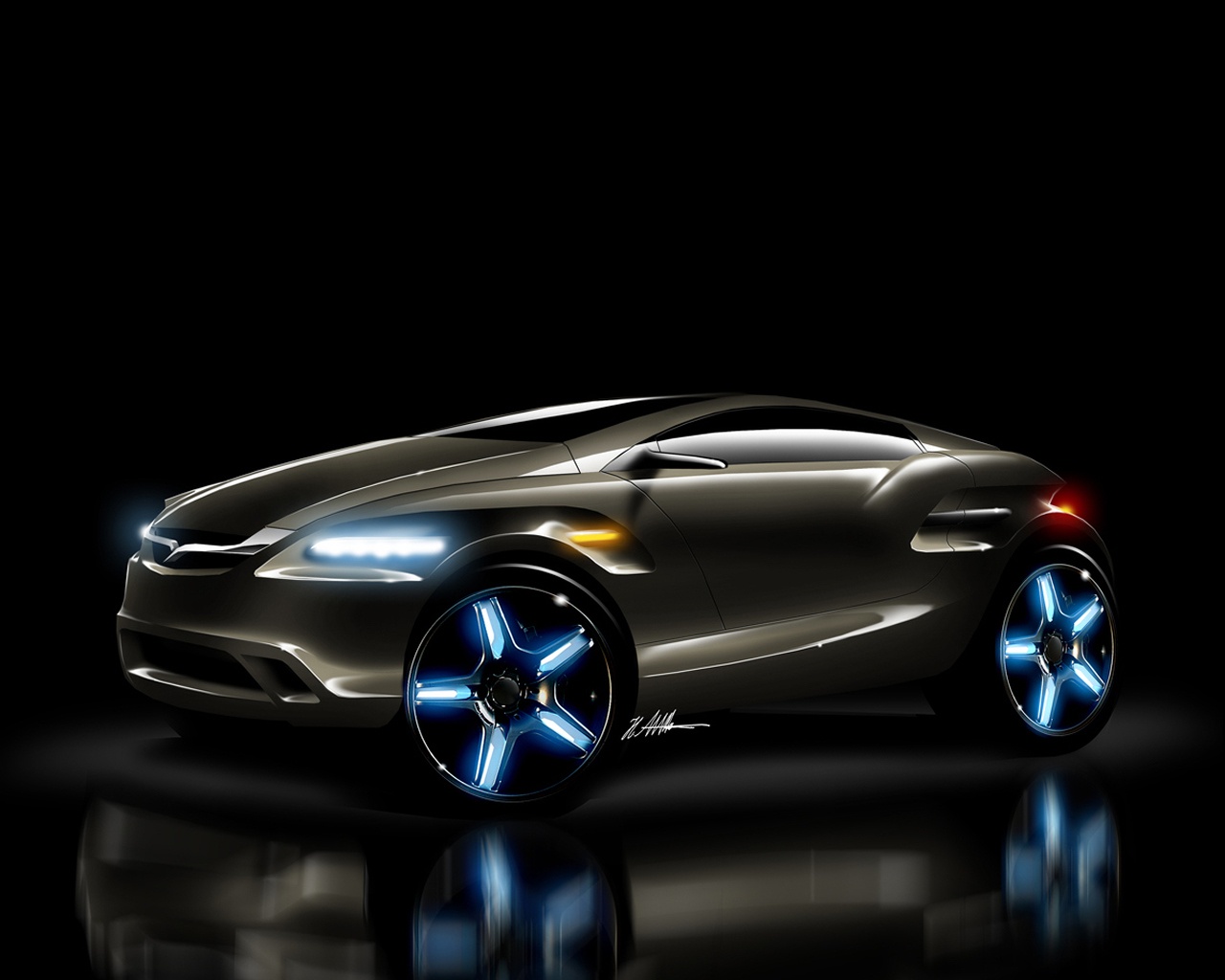 Description: A car is shown in a dark room with a reflection on the floor and a black background with a reflection of the car.