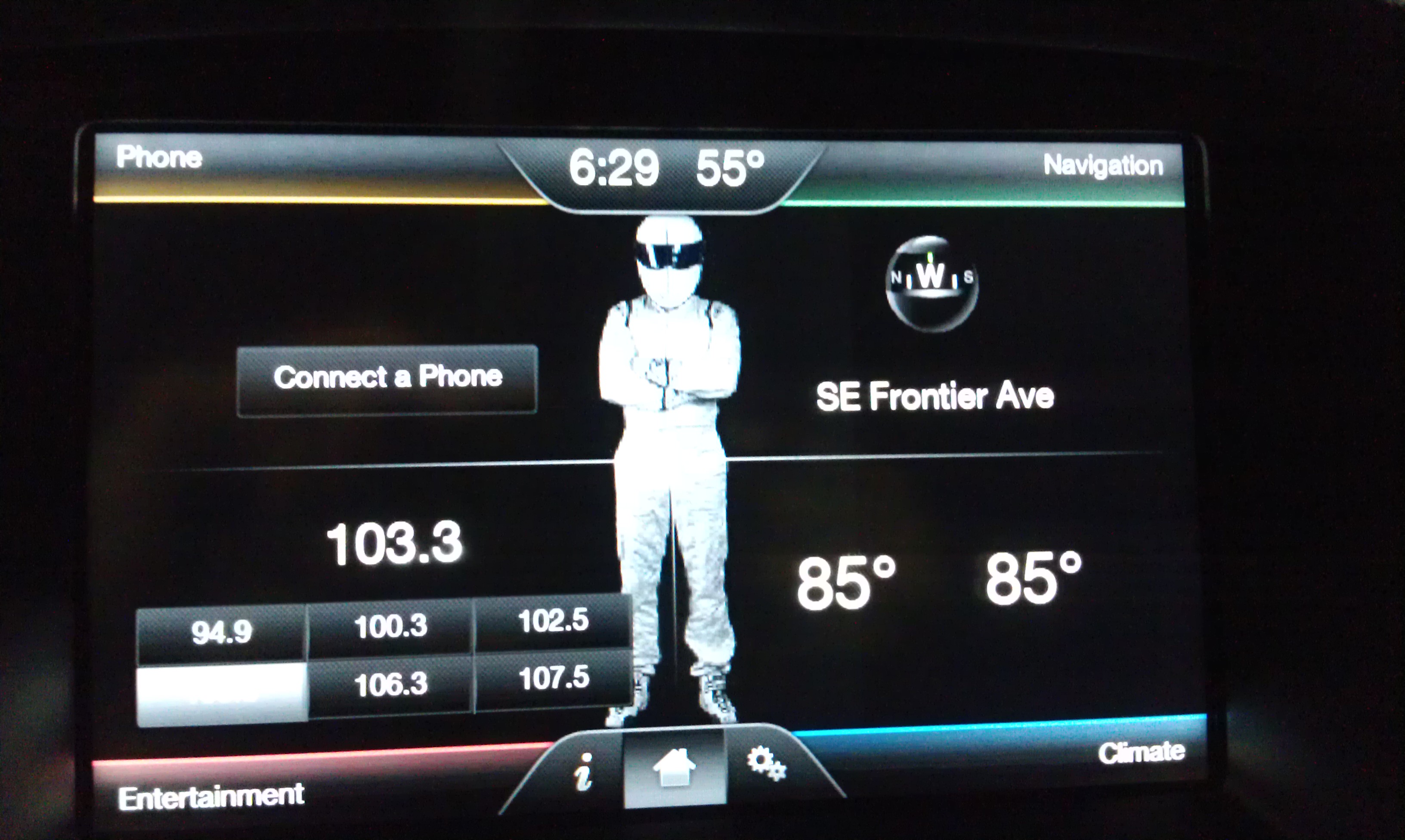 Description: A car dashboard with a person standing on it's display screen and numbers on the screen and a cell phone.