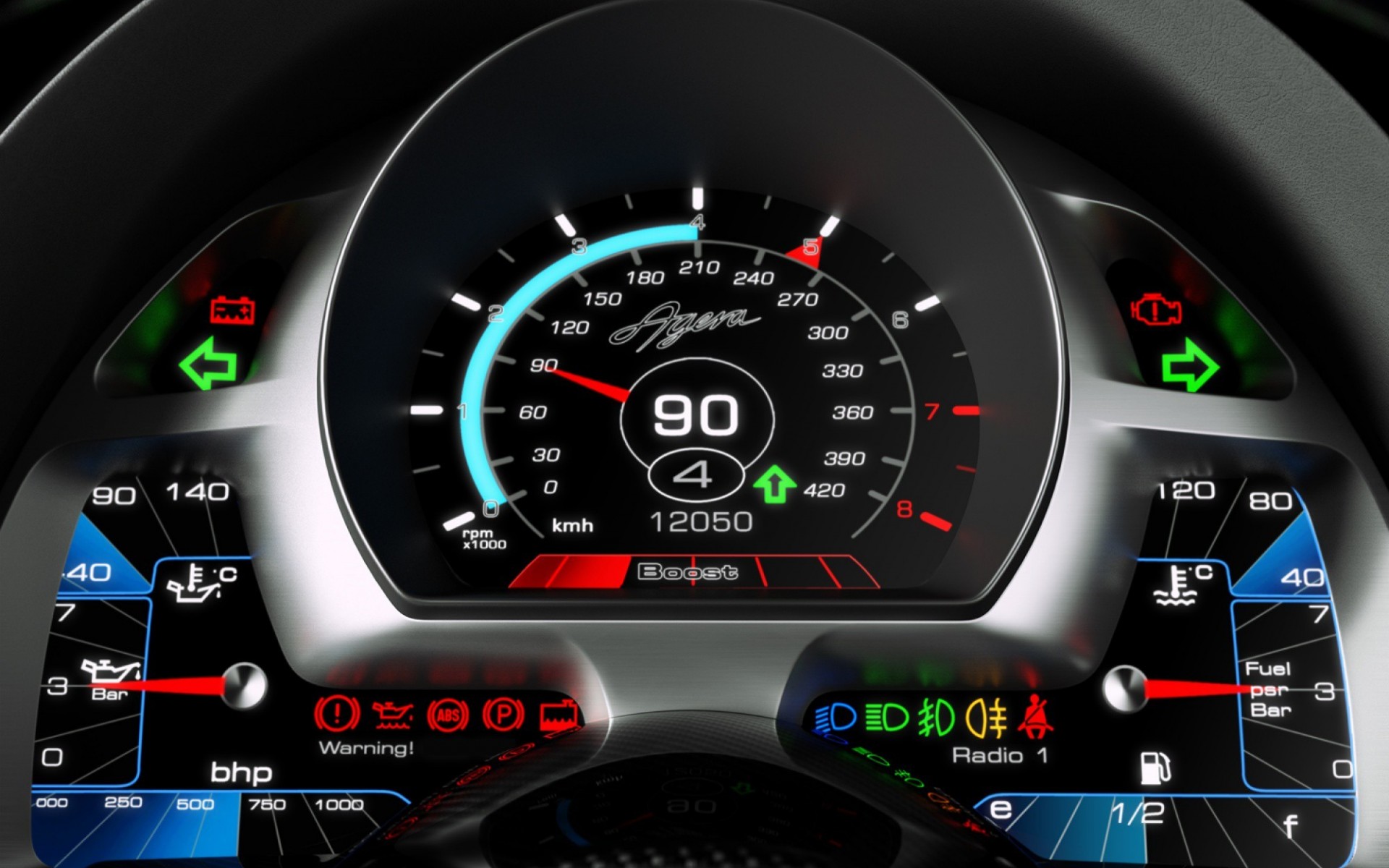 Description: A dashboard of a car with a speedometer and other gauges on it's display screen and a clock.