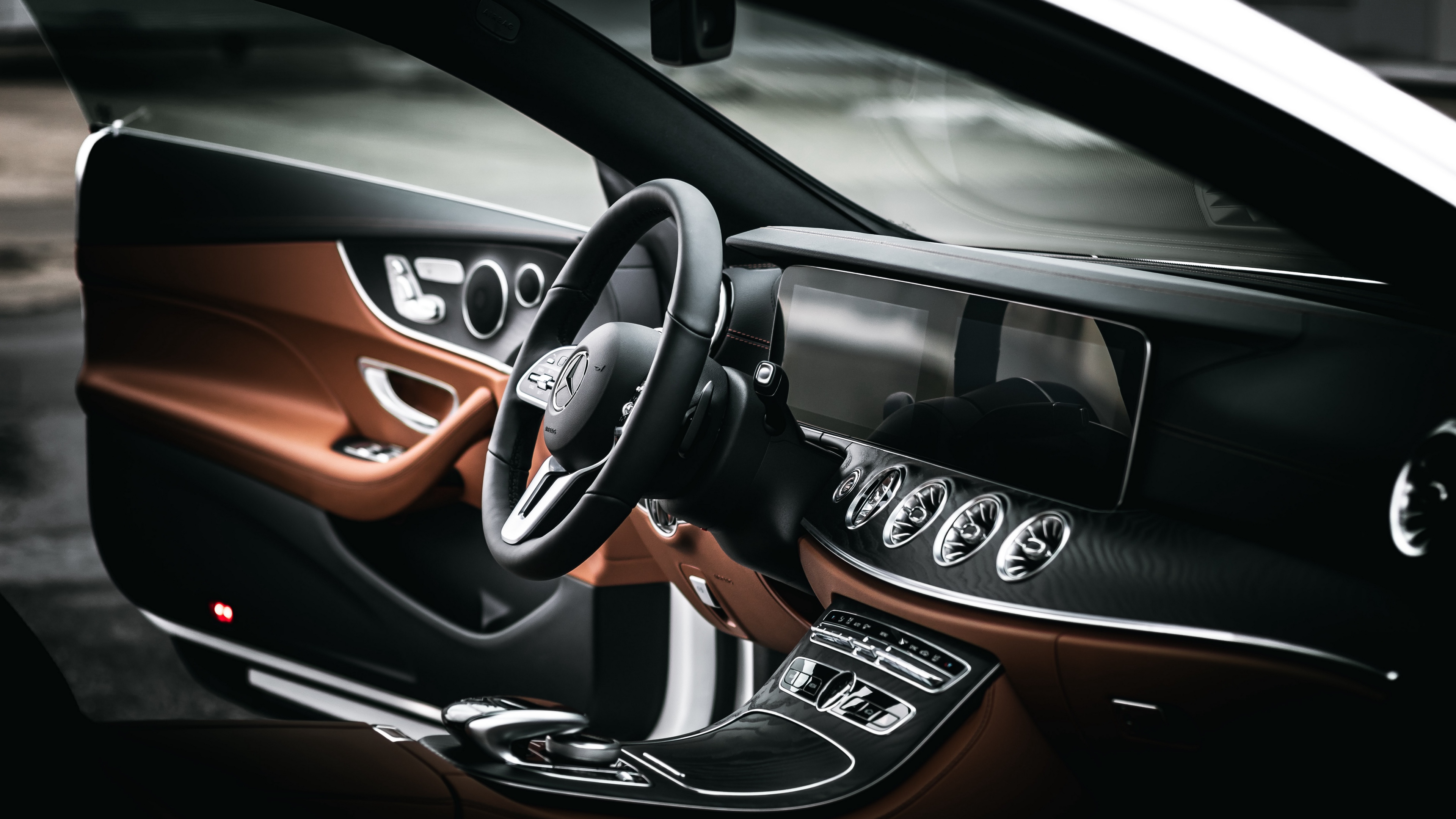 Description: A car dashboard with a steering wheel and a dash board with a digital display on the dash board and a dash light.